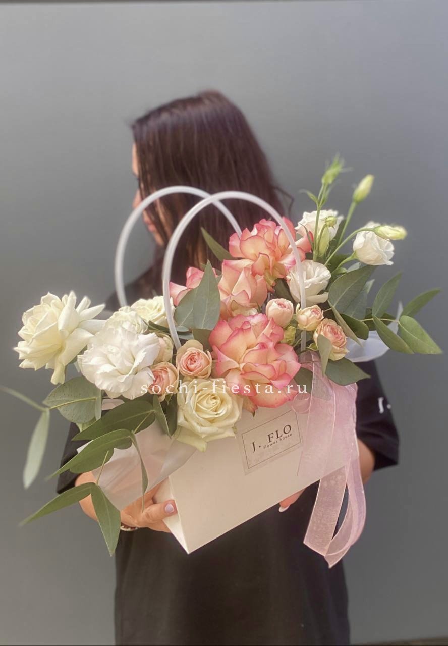 вывернутые белые розы и джумилия, цилиндр D16, эвкалипт, лента, упаковка.