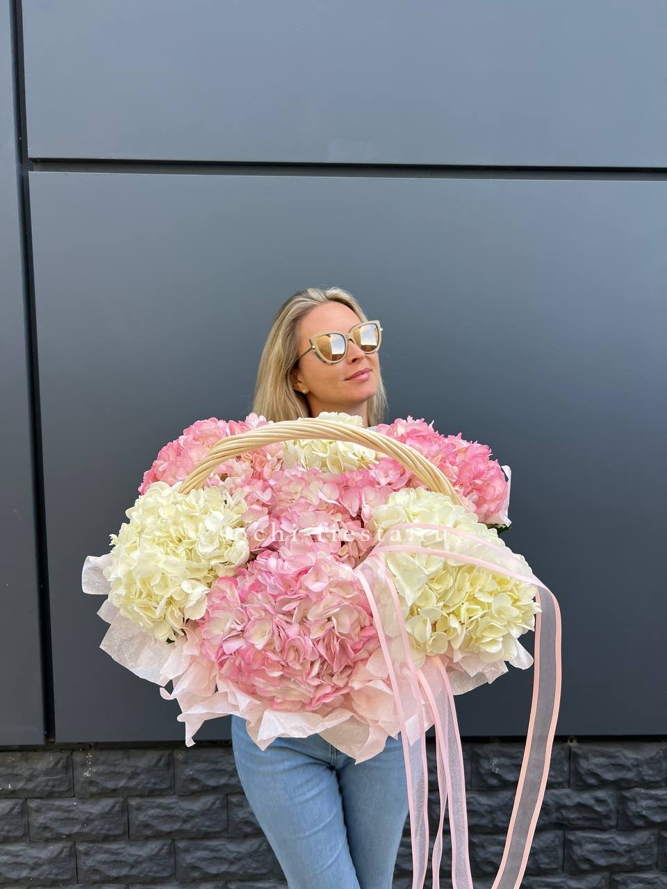 гортензия - 7 шт., лента, корзина.