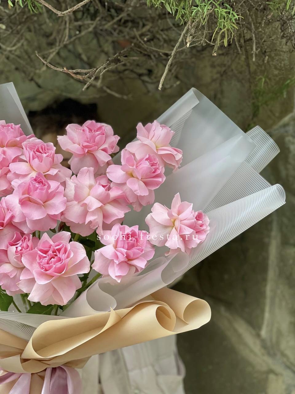 Букет выглядит объемно и держит форму благодаря плотной сборке.