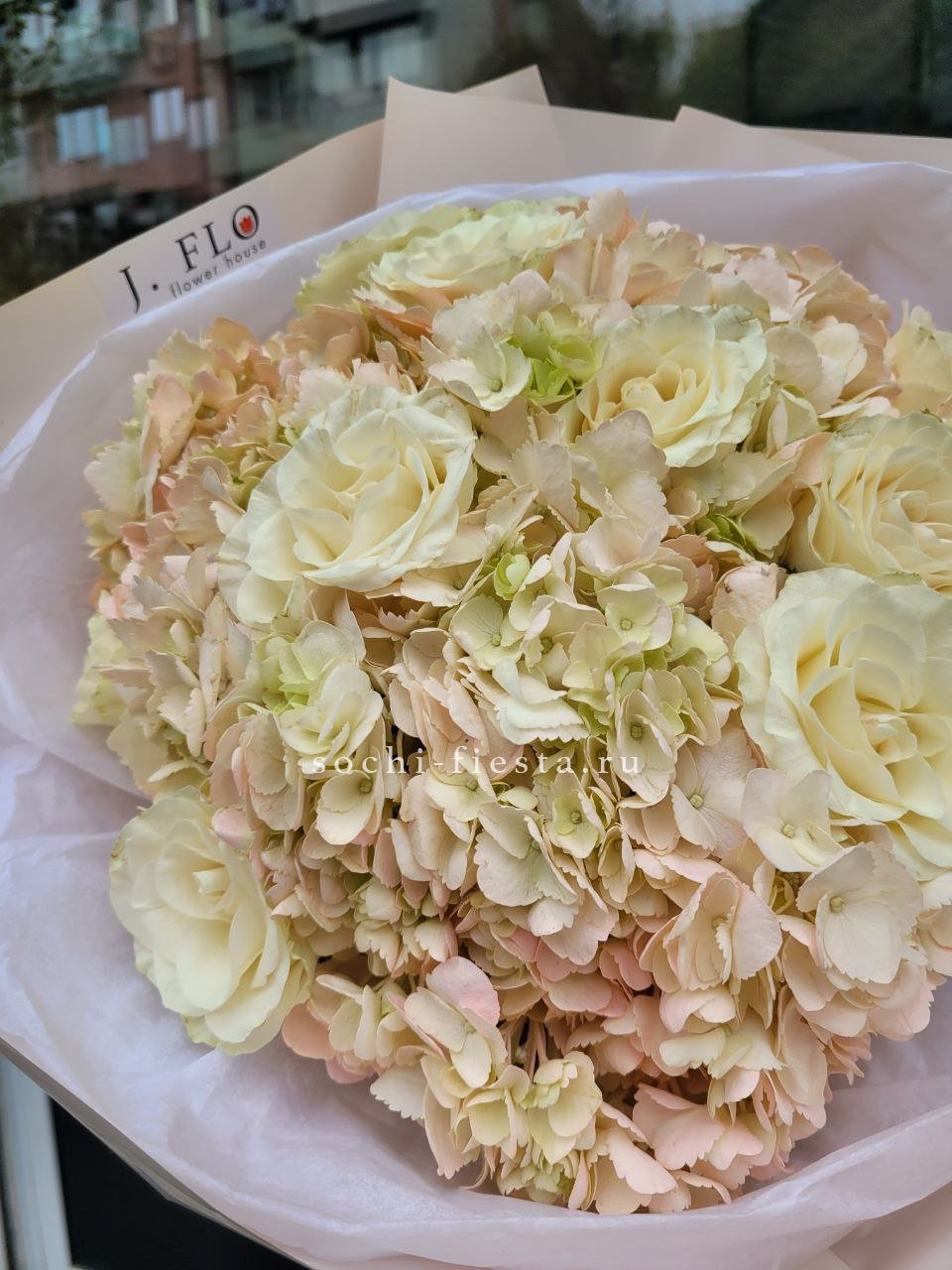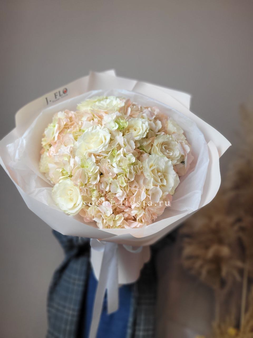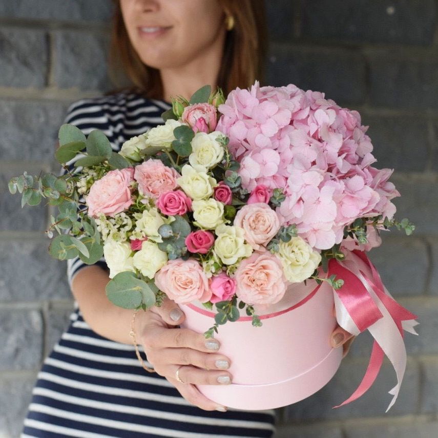 Крупные шапки гортензий формируют основу композиции, розы и эустомы заполняют пространство между ними. Диантусы добавляют графичности. Букет с впечатляющим присутствием и богатой палитрой.