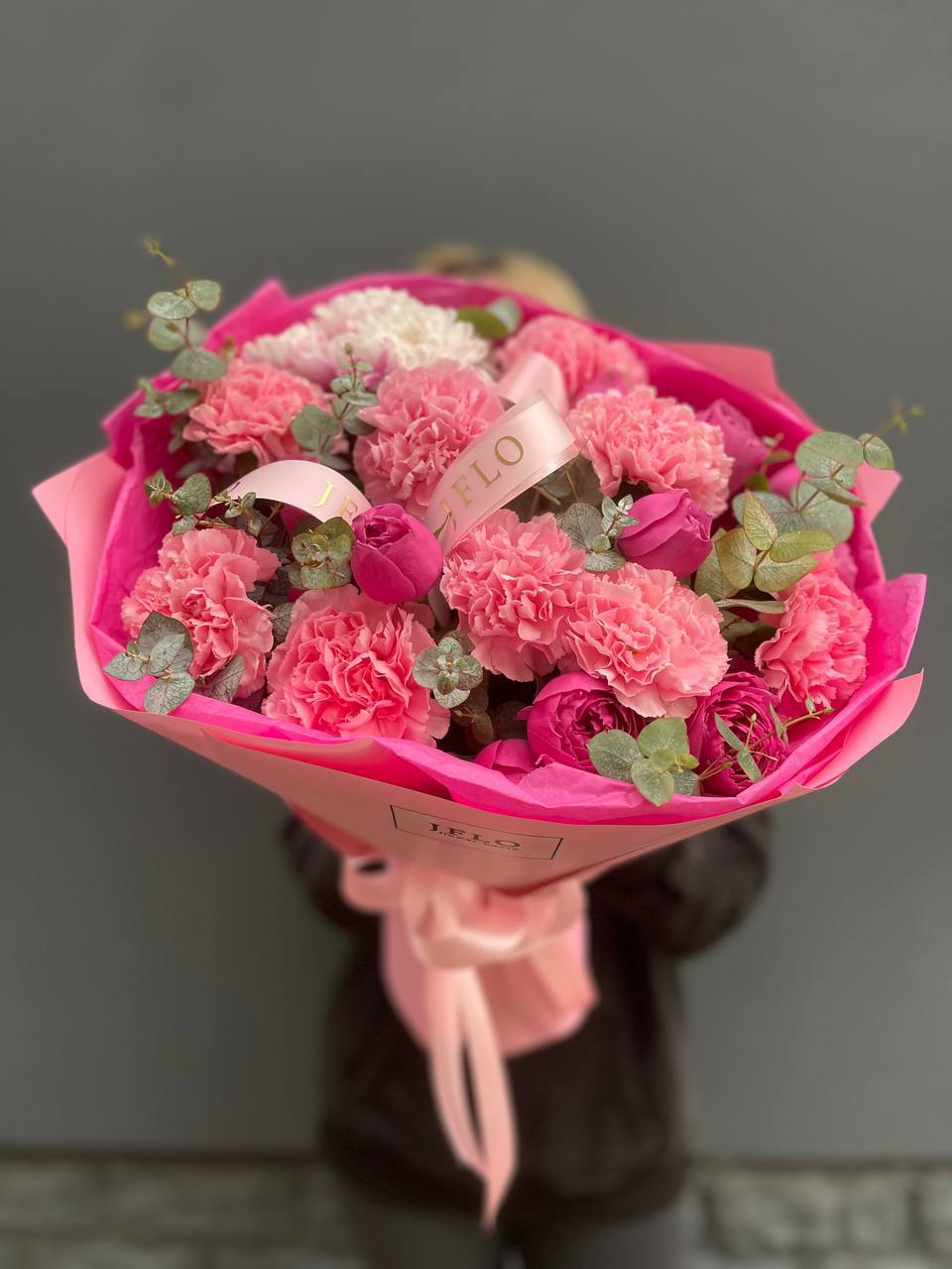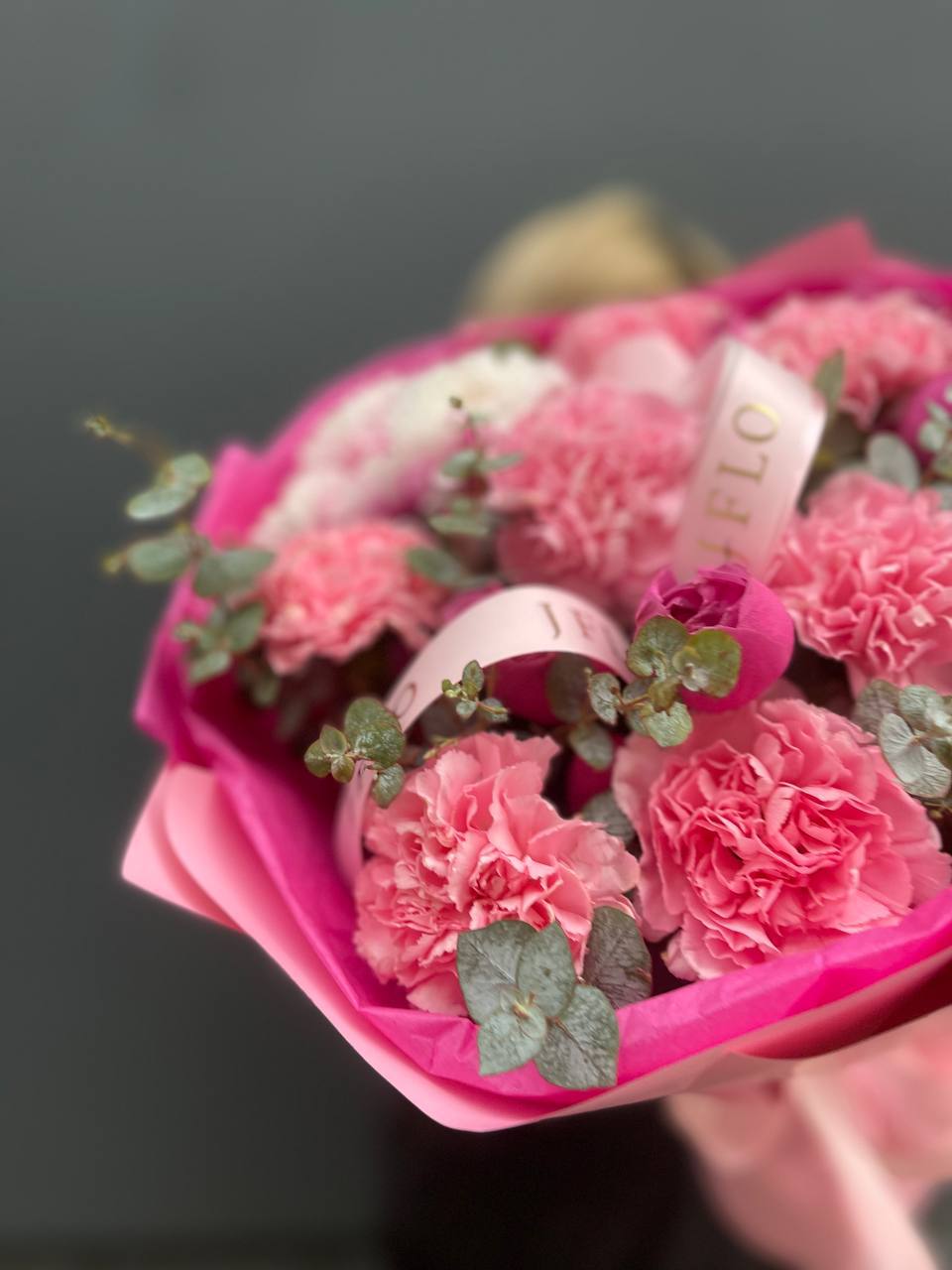 бомбастик, хризантема, эустома, эвкалипт, пленка.