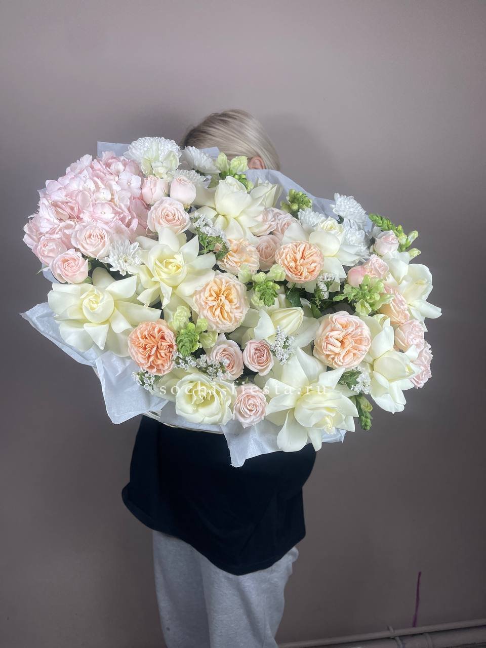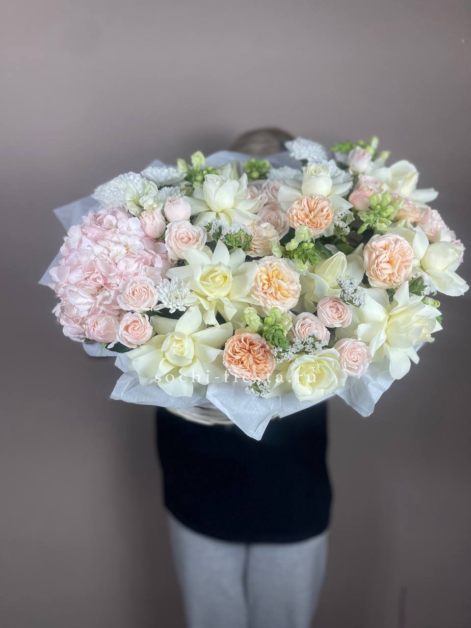 Актуальный и модный букет в трендовой палитре. Сочетание нежно-розовых и белых оттенков с матовой упаковкой отвечает последним тенденциям флористики. Легкость, воздушность и тщательно подобранный состав делают эту композицию идеальным выбором для стильной девушки или современного торжества. Безупречный вкус в каждой детали.