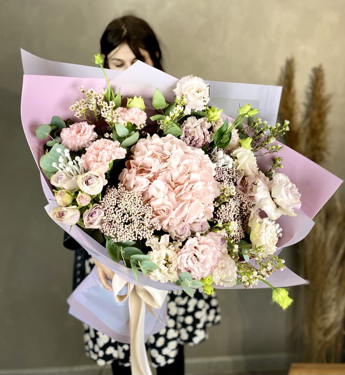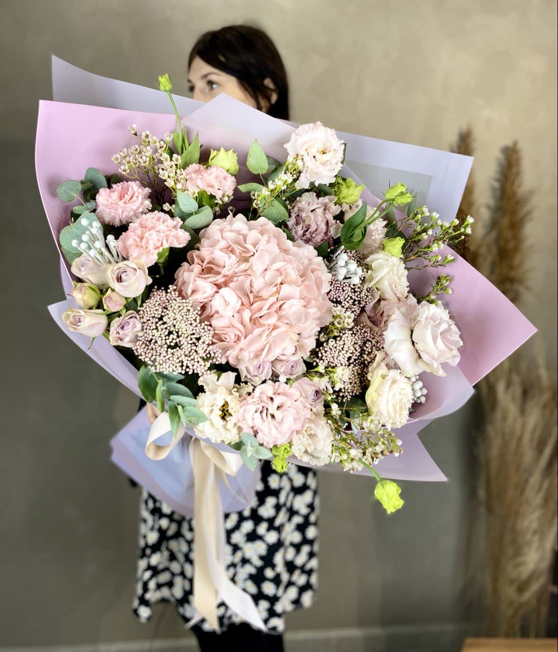 Розовые тона переплетаются с белыми вкраплениями гортензии. Кустовые розы и маттиола дополняют объемную композицию свежими акцентами.