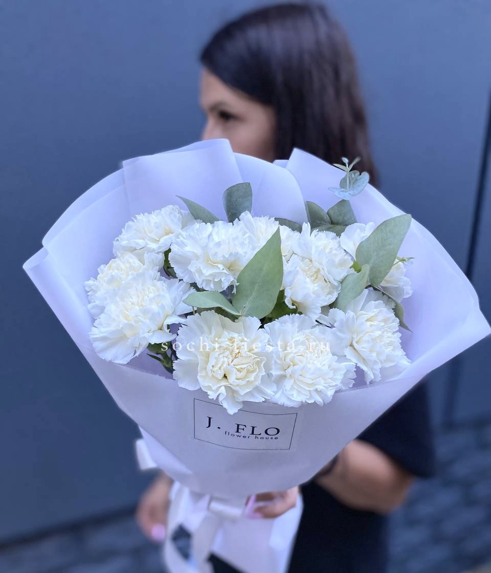 Диантусы с их густыми бутонами и резной формой лепестков выглядят графично и современно. Белый цвет усиливает архитектурность линий и создаёт чёткий визуальный ритм.