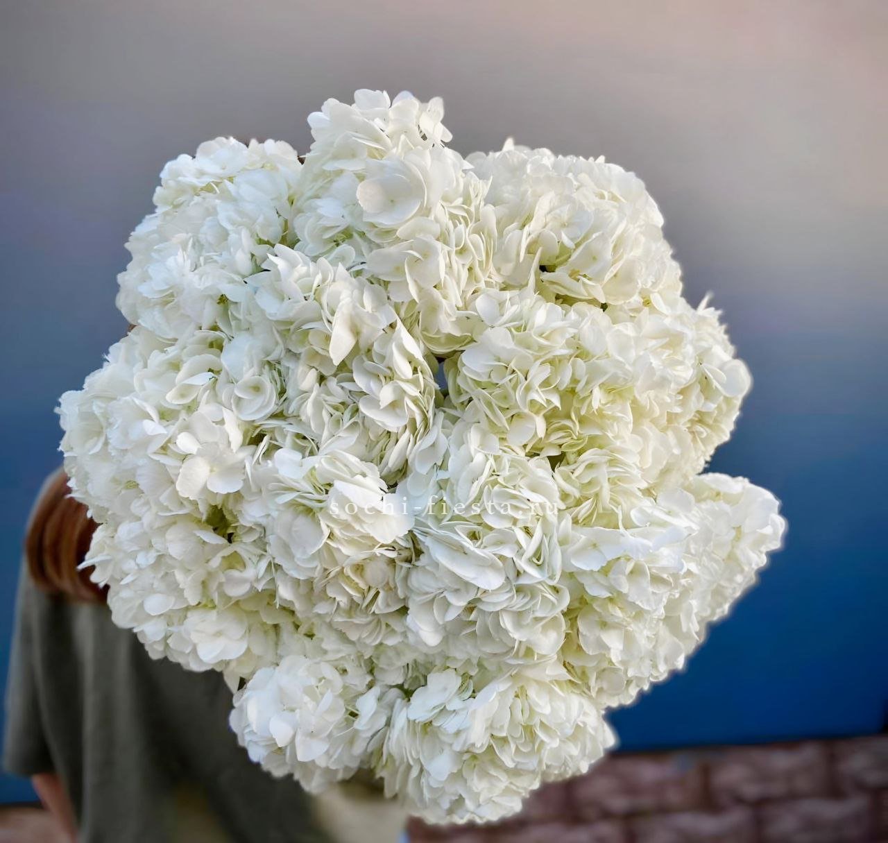 Девятнадцать соцветий гортензии собраны в объемную композицию с естественной воздушностью. Каждая головка раскрывается множеством мелких лепестков, создавая плотное цветовое облако.