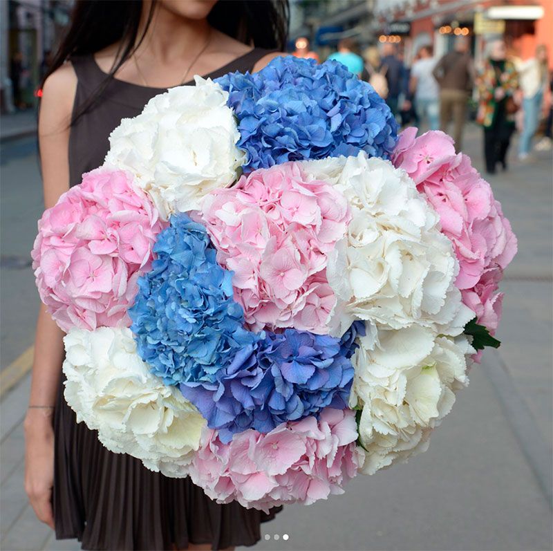 Букет из семи гортензий объединяет разные оттенки в единую композицию с живым ритмом. Переходы цвета создают динамику, а плотные соцветия формируют выразительный объём.