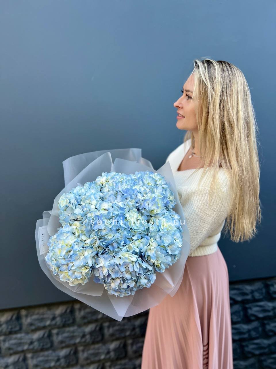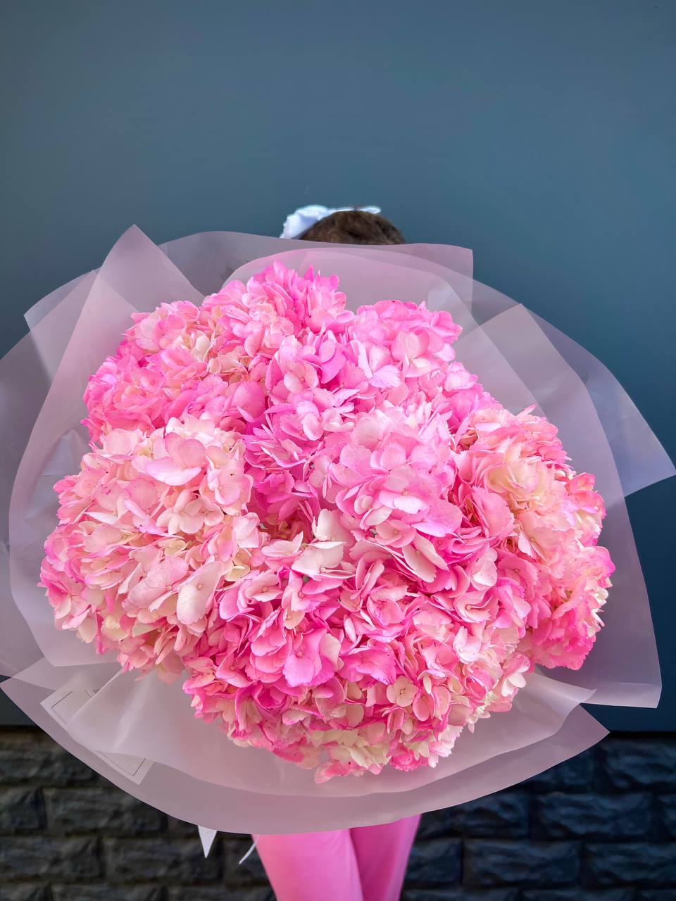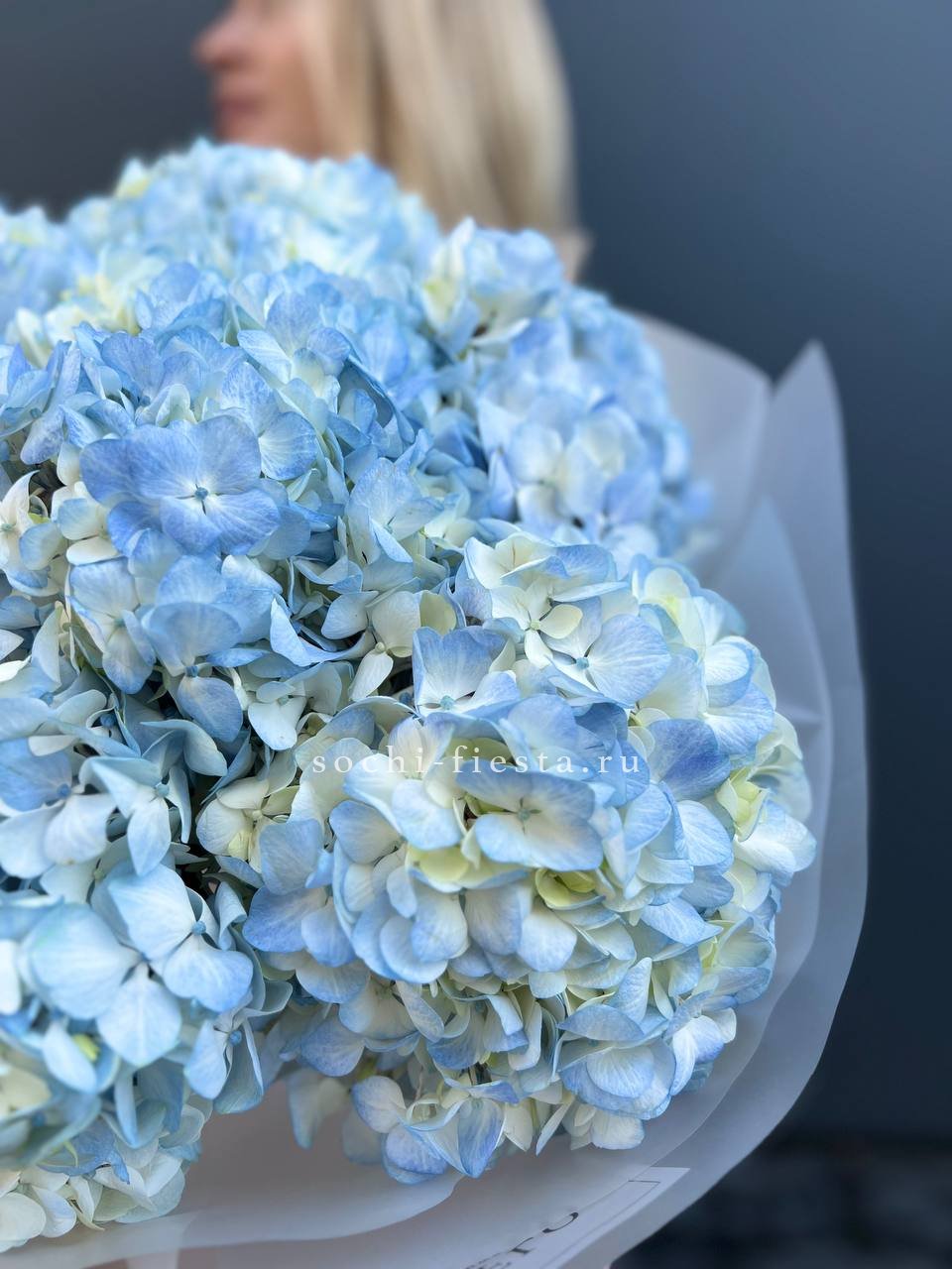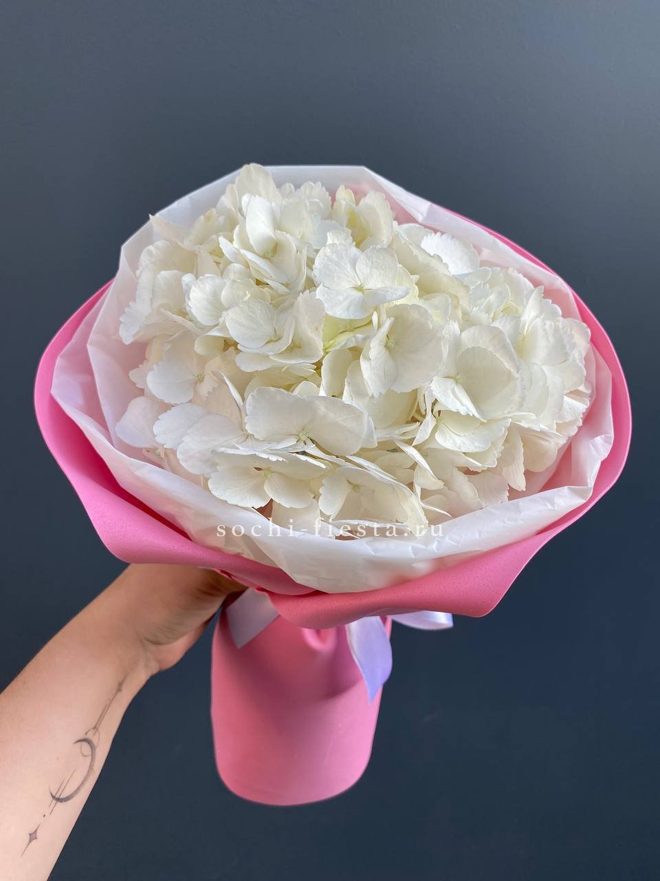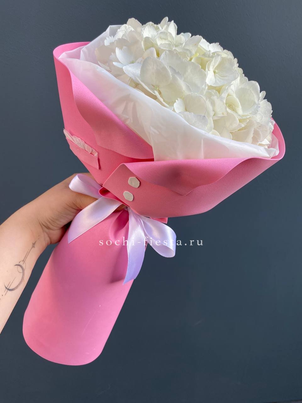 Пять соцветий гортензии в оригинальной упаковке-пиджачке. Необычная форма подачи превращает классический монобукет в яркий акцент для торжественного момента.