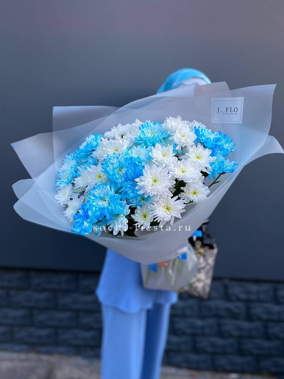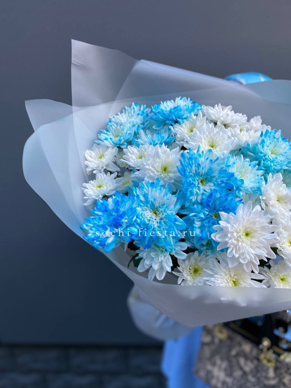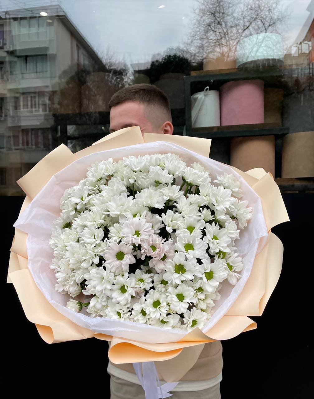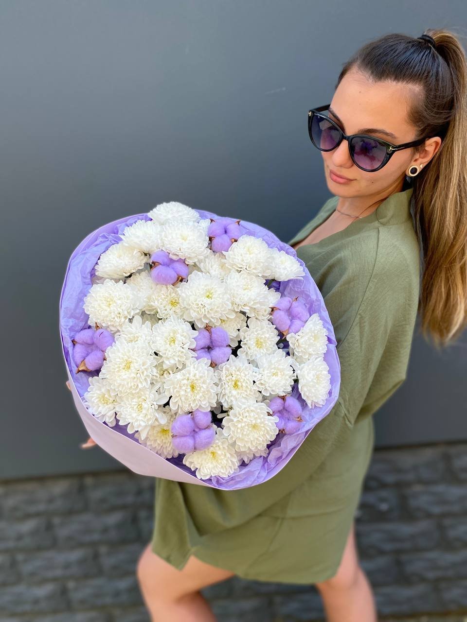 Пятнадцать веток кустовой хризантемы образуют пышное облако из множества соцветий. Каждая ветка раскрывается по-своему, создавая живую текстуру и объёмный силуэт букета.