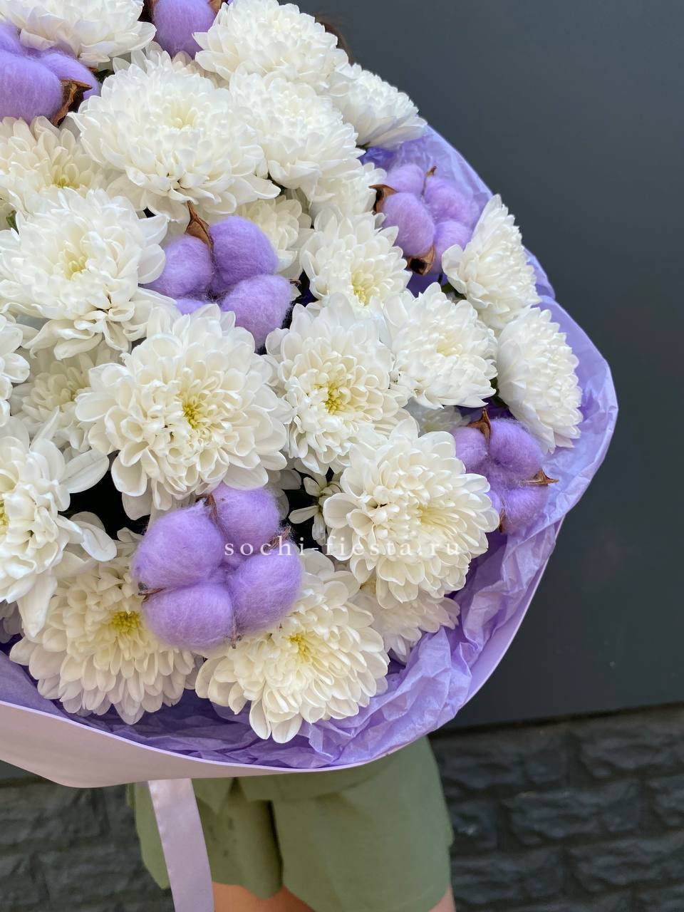 хризантема кустовая - 15 веток, лента, дизайнерская пленка.