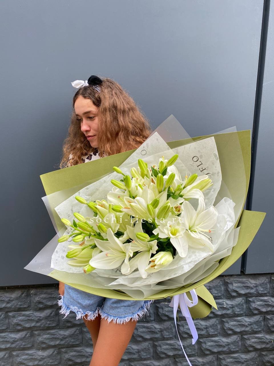 Насыщенный зелёный оттенок упаковки перекликается с природной свежестью лилий. Семь бутонов формируют объёмную композицию с выразительным цветовым акцентом. Букет привлекает внимание и удерживает его надолго.