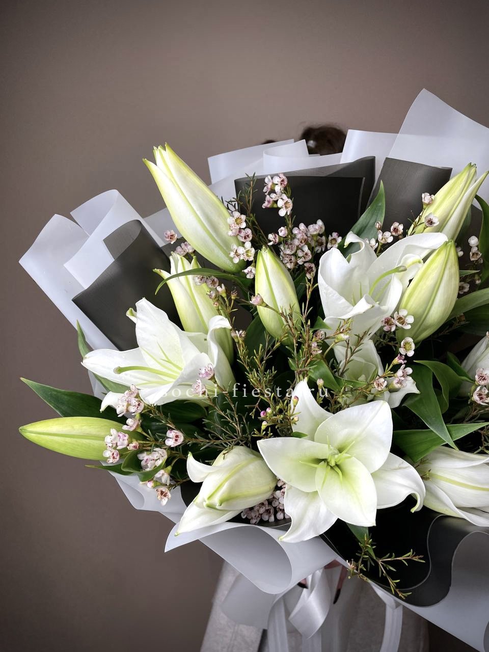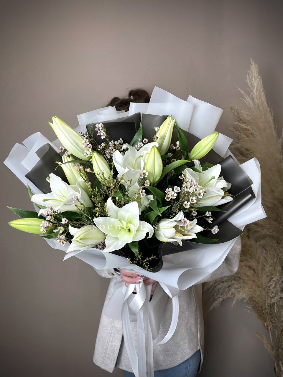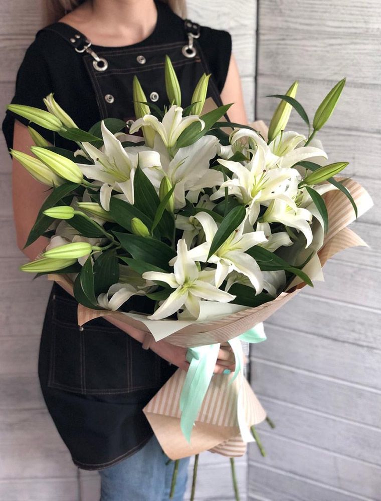 Пионовидные лилии с махровыми бутонами дополнены воздушным лимониумом. Девять стеблов образуют пышную форму, где каждый цветок раскрывается слоями.