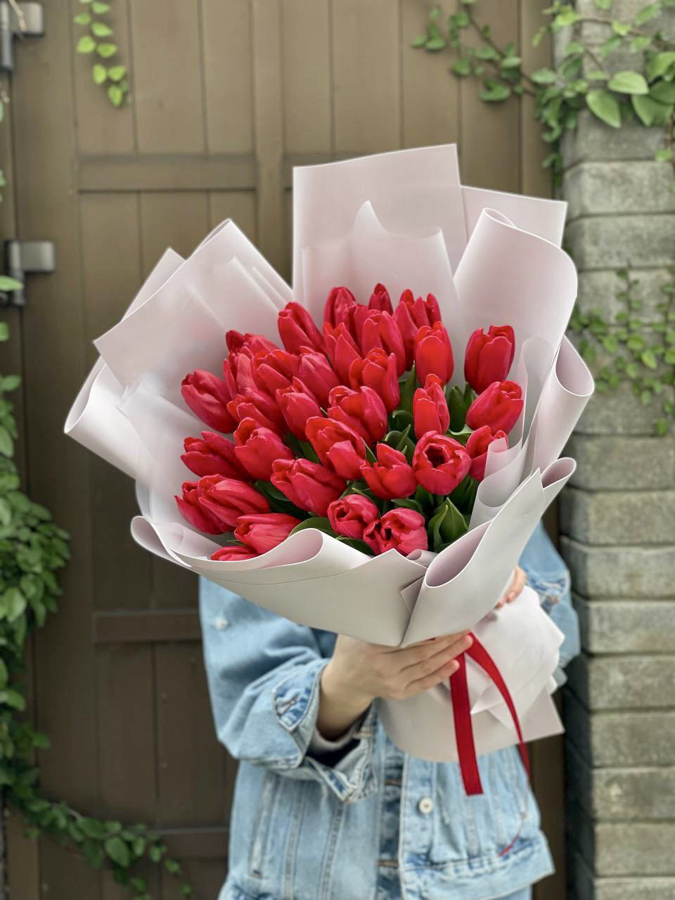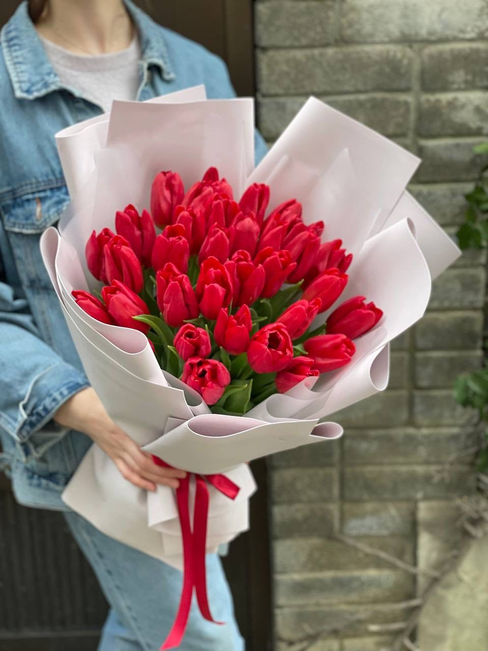 Сто один тюльпан в светлой гамме создаёт впечатляющий объём и выразительное присутствие. Плотная сборка бутонов образует графичную форму с чётким силуэтом.