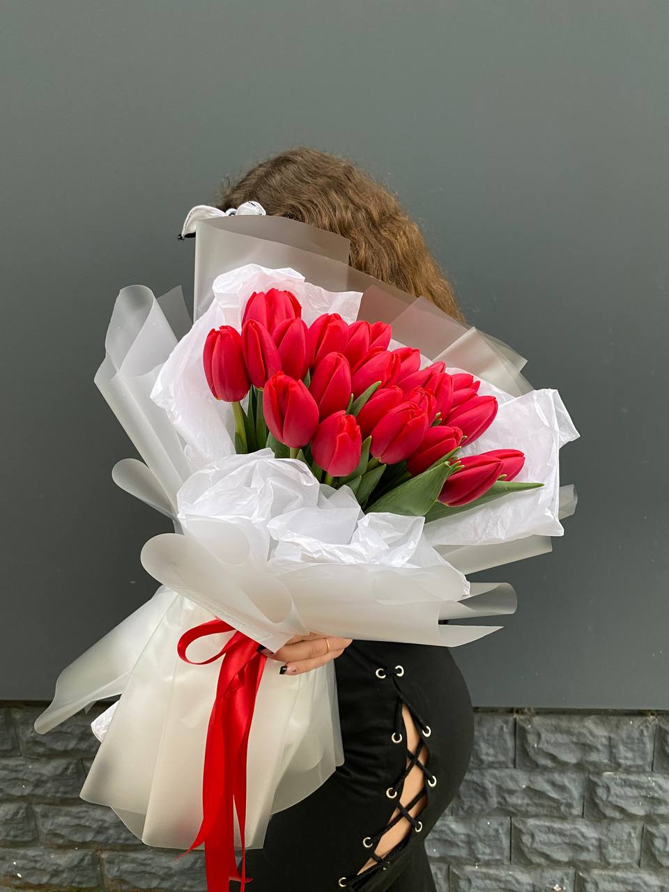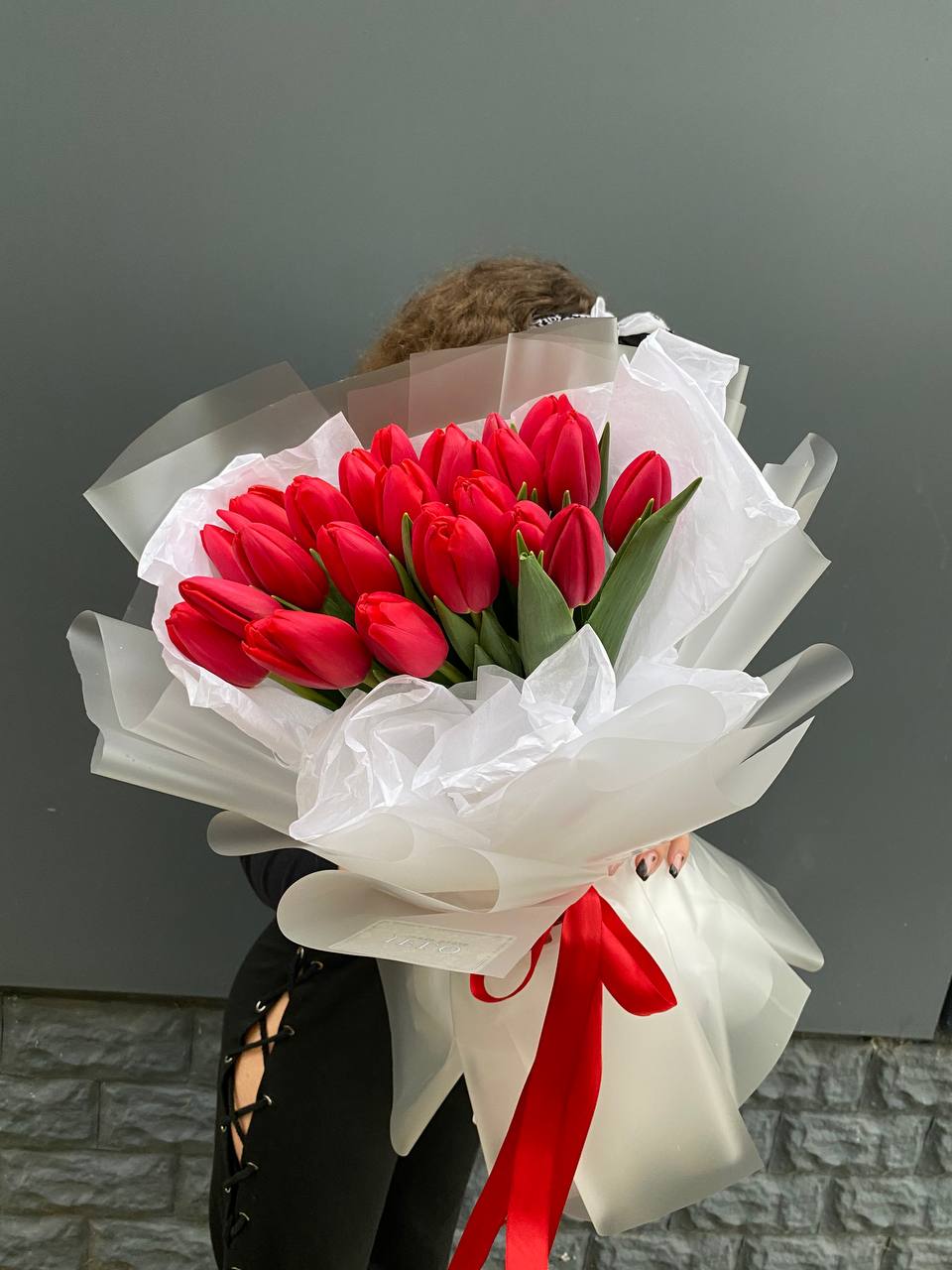 Тридцать пять стеблей выстроены в динамичный вертикальный силуэт. Красный цвет звучит ярко и собранно, а линии букета держат чёткий ритм без лишних деталей.