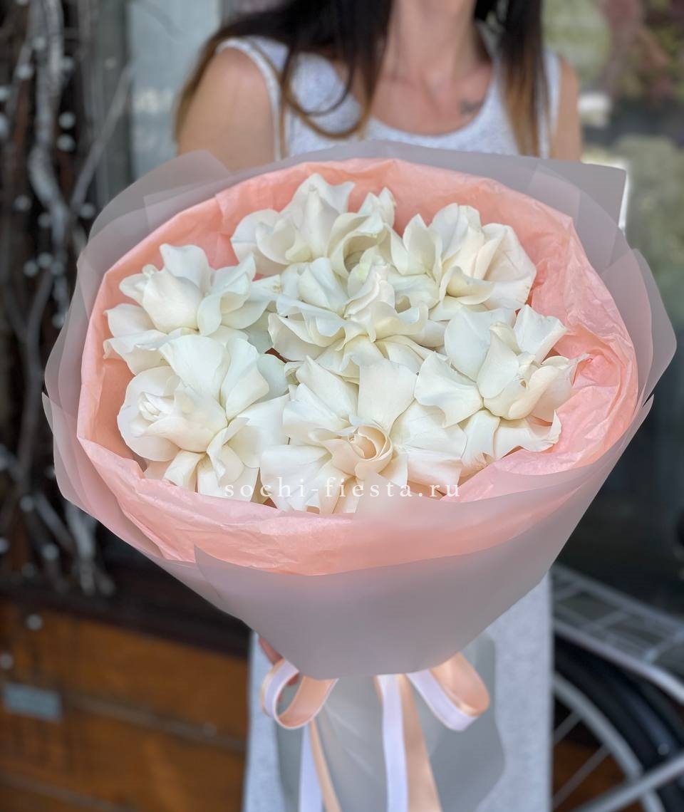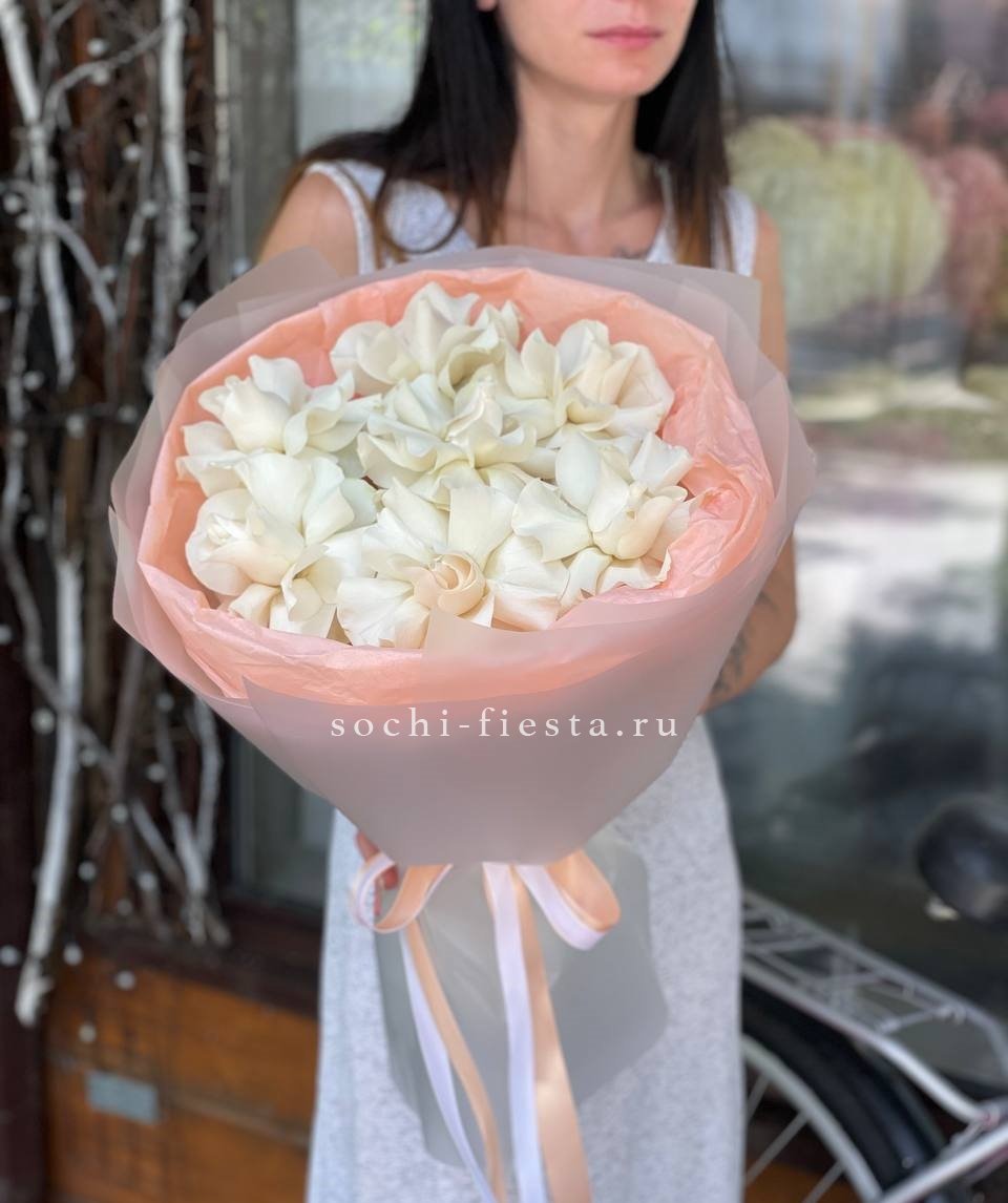 Кремовая палитра с переходами от молочного до сливочного оттенка объединяет розы, эустому и пушистую гортензию. Букет выглядит цельно и мягко, словно утренний свет на лепестках.
