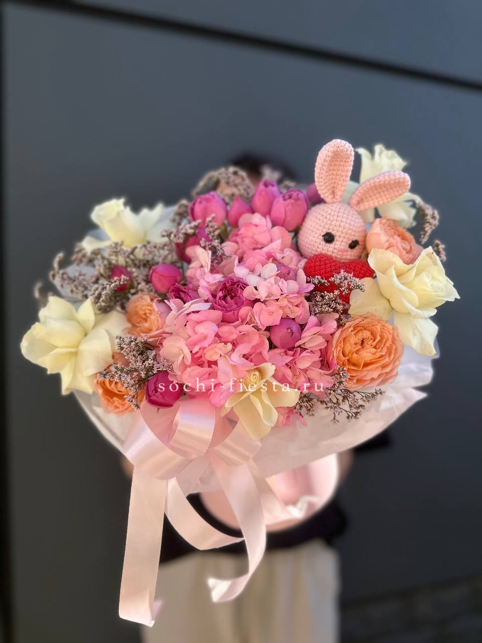 Композиция в цилиндре объединяет одноголовые и кустовые розы с пышной гортензией. Лимониум добавляет воздушности. Мягкая игрушка завершает образ.