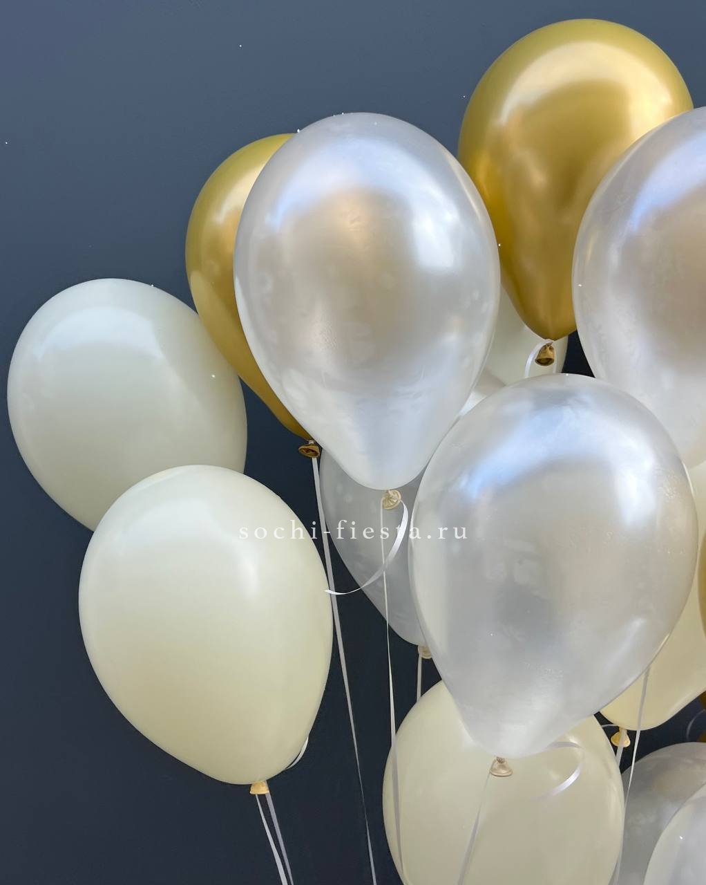 облако из 7 шт. хромированных золотых шаров, 7 шт. шаров белого цвета, 6 шт. шаров нежно-розового или кремового цвета, а также грузика. Все шары мы предварительно обрабатываем специальным составом Highfloat, обеспечивая им длительный срок полета.