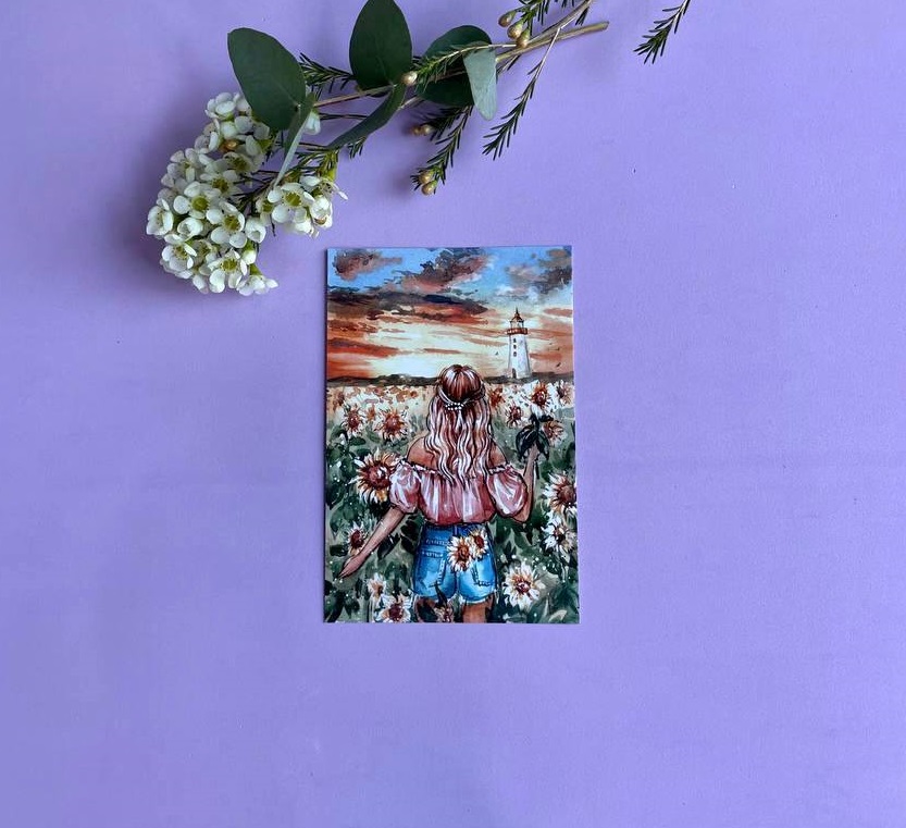 Открытка Sunflower с ярким солнечным принтом дополнит ваши слова теплом и летним настроением. Вмещает до семи предложений текста, который мы внесём за вас.