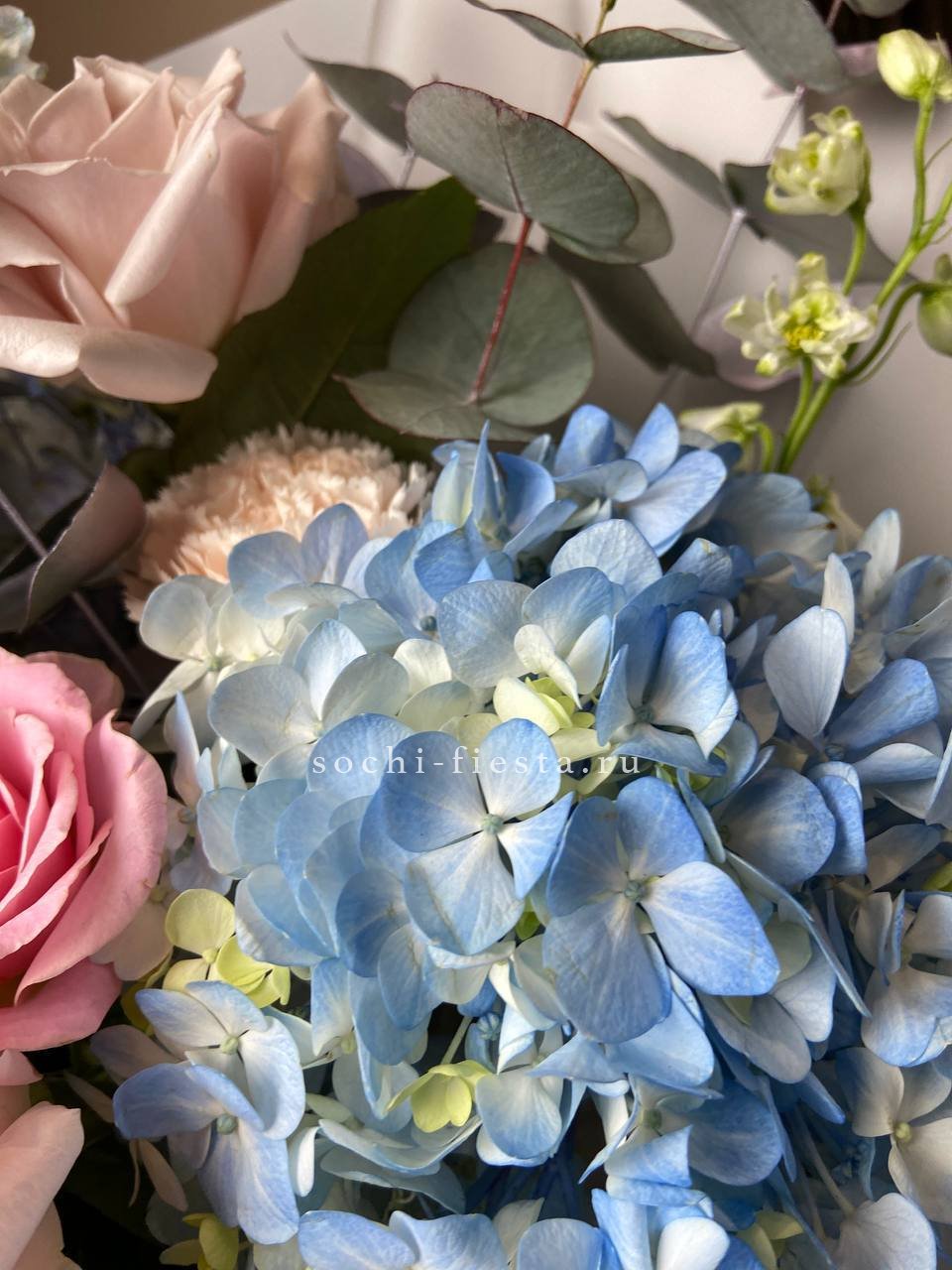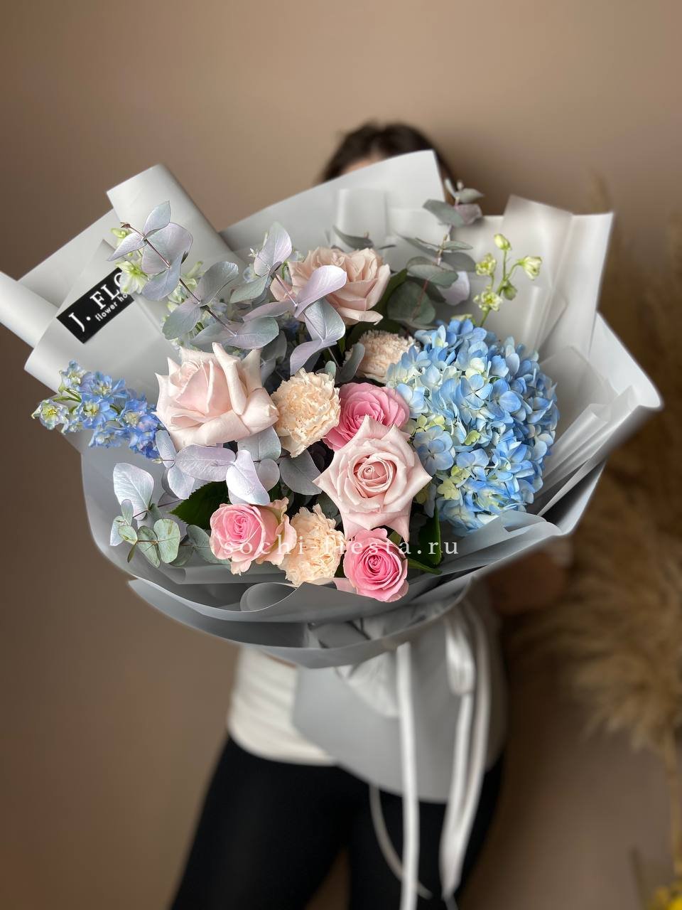 Пионовидные розы соседствуют с классическими, создавая игру объёмов и плотности бутонов. Диантус вплетается между ними легкими штрихами. Эвкалипт добавляет воздуха и завершает силуэт.