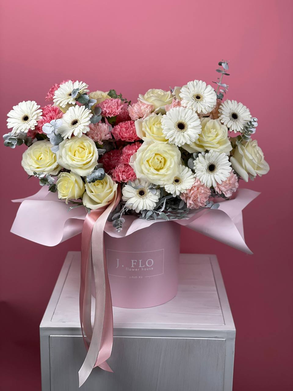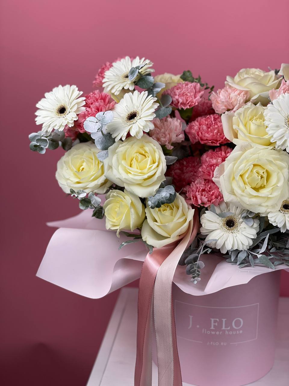 Кустовые розы Бомбастик с густо набитыми лепестками раскрываются в компактной форме. Эвкалипт подчёркивает пудровый оттенок бутонов, а цилиндр с бумагой тишью делает композицию завершённой.