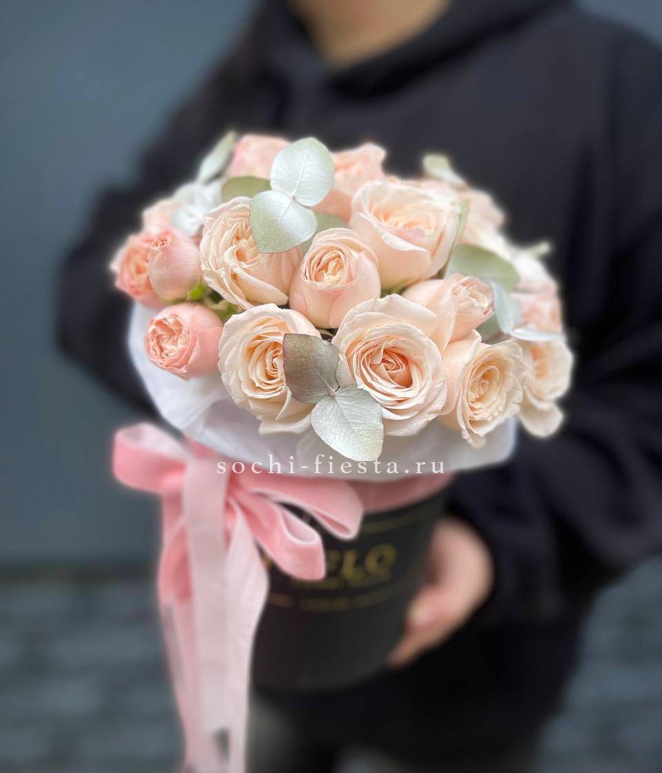 кустовые пионовидные розы Бомбастик, эвкалипт, цилиндр D13, бумага тишью, лента.