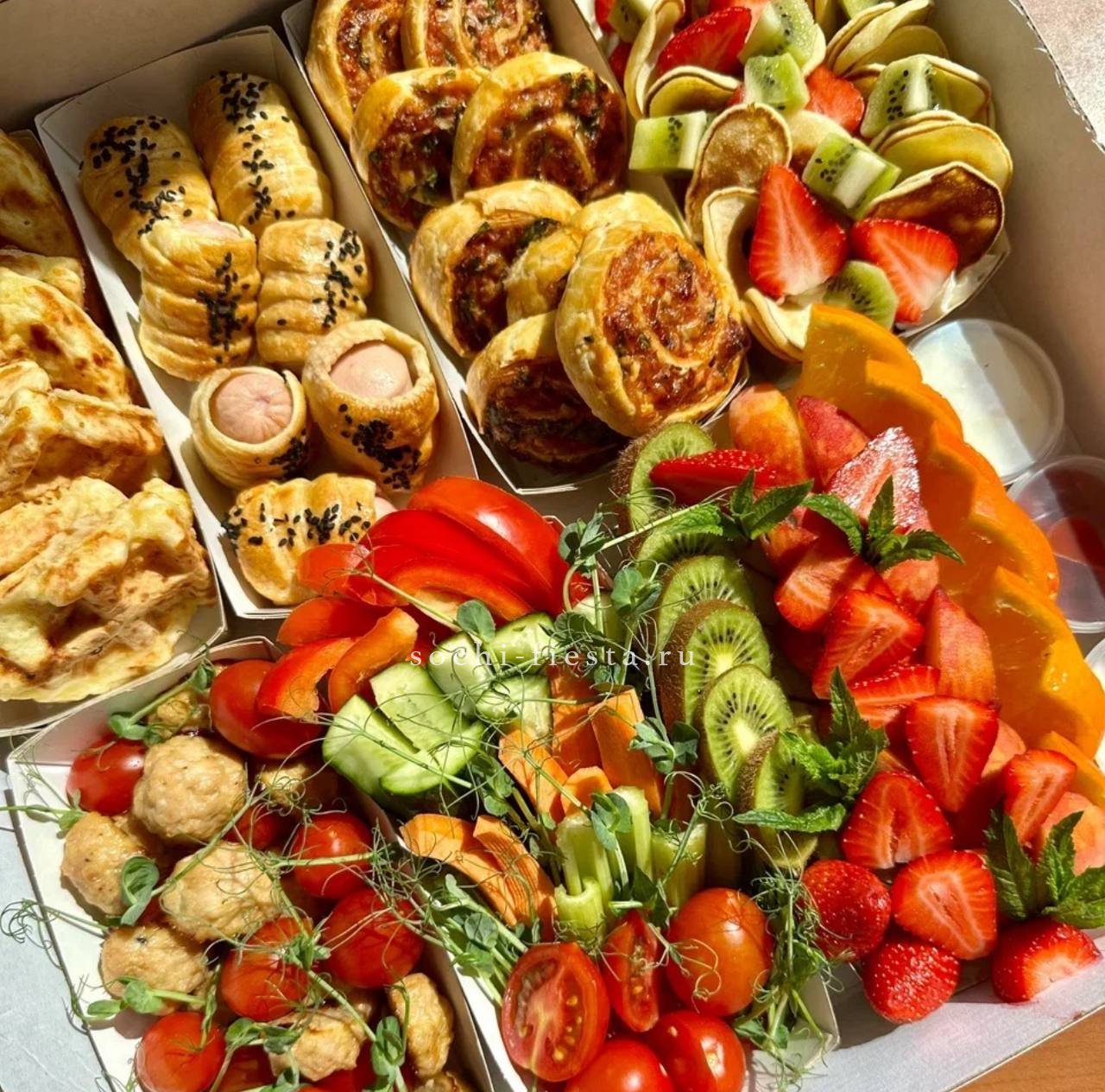минибургер из свежевыпеченной булочки с кунжутом с куриной котлетой, сыром чеддер, соленым огурцом, свежим томатом, луком и салатом, заправка: авторский томатный соус- 14 шт. Картофельные шарики, подаются в стаканчиках- 4 стаканчика по 5 шт. Куриные нагетсы в кукурузной панировке, в стаканчиках- 4 стакана по 6 шт. Овощная корзинка. Фруктовая корзинка. Соусы красный и белый- 4 шт.