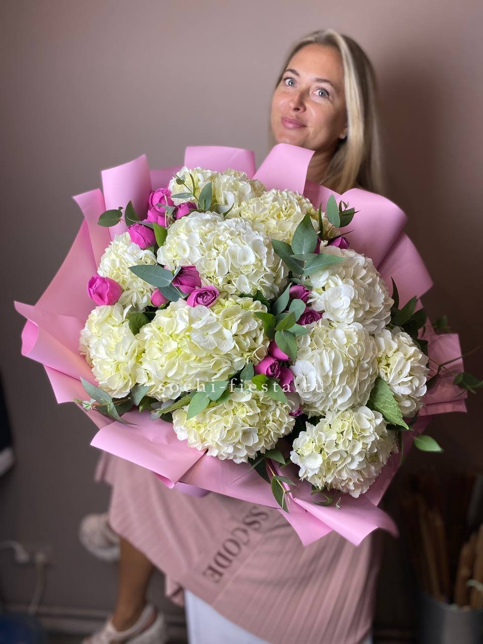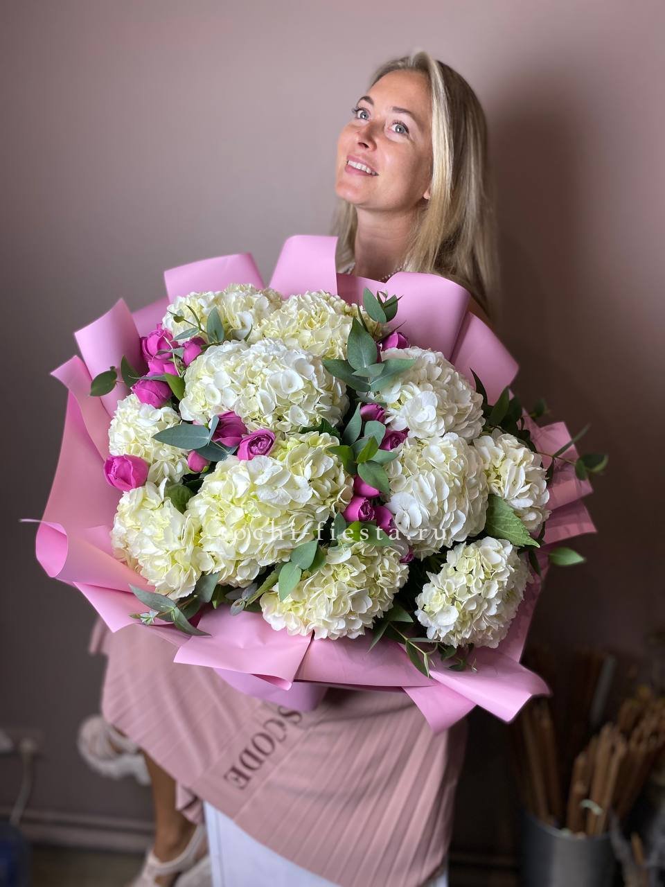 гортензия розовая, лента, дизайнерская упаковка. Цвет гортензий может незначительно отличаться.