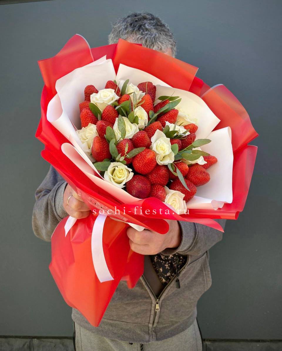 Кустовая роза окружает сочную клубнику, а эвкалипт добавляет свежести всей композиции. Букет упакован в дизайнерскую бумагу и перевязан лентой для аккуратной формы.