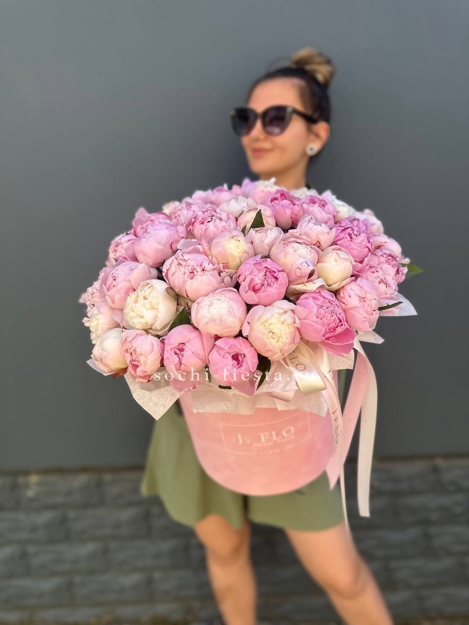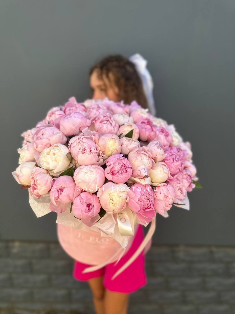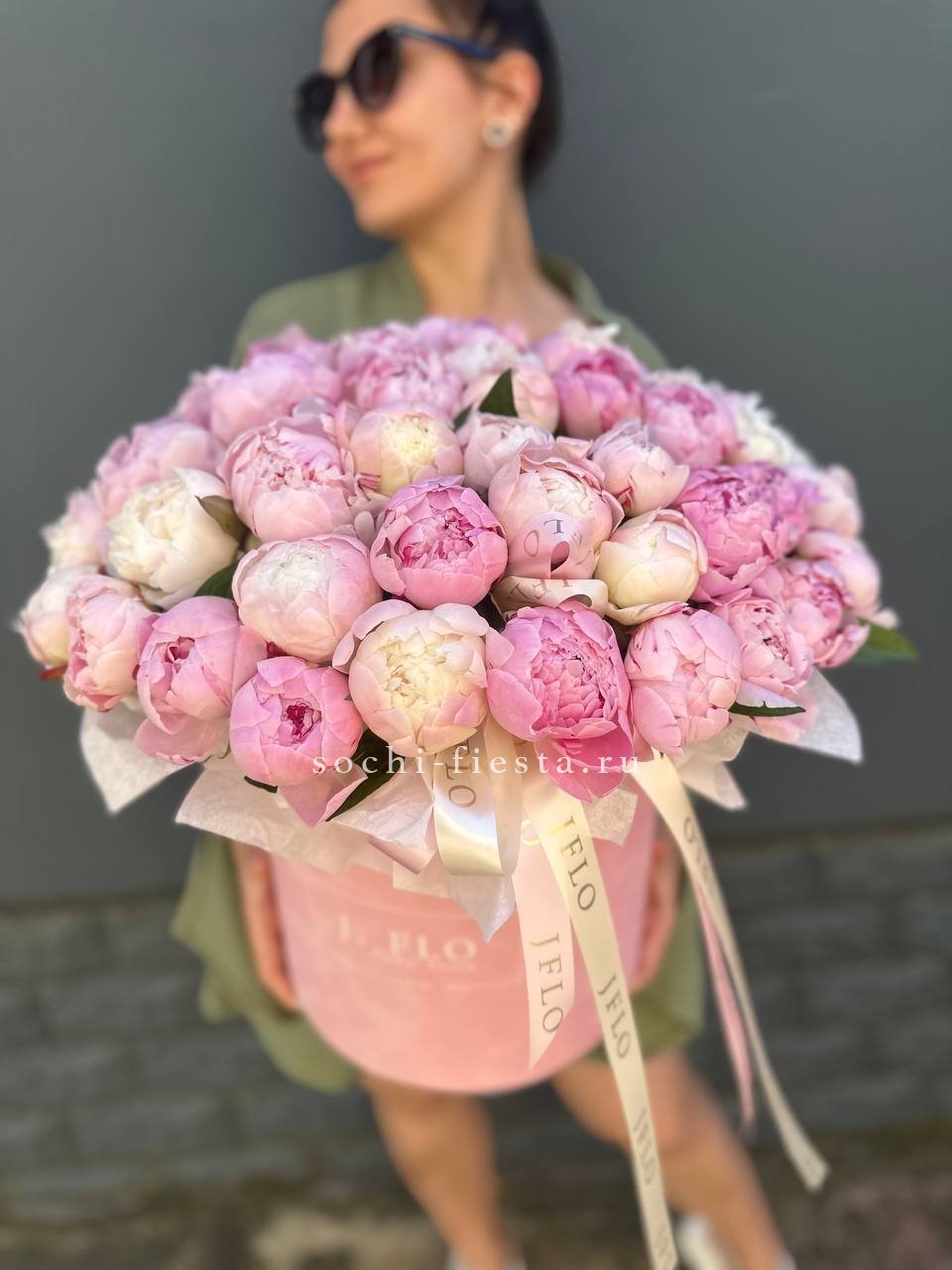 Пятьдесят один пион в цилиндре раскрывается волнами: от туго свёрнутых бутонов до пышных головок с вывернутыми лепестками. Каждый цветок живёт своим ритмом, создавая живую фактуру. Композиция дышит и меняется.
