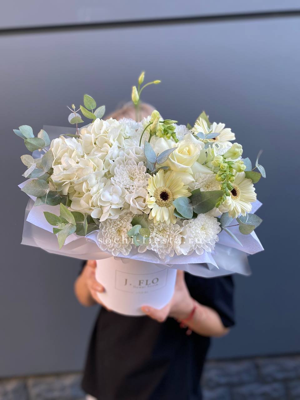Белые розы и гортензия формируют объёмную основу, лилии вытягивают композицию вверх. Диантус и статица заполняют промежутки, создавая плотную текстуру в цилиндре.