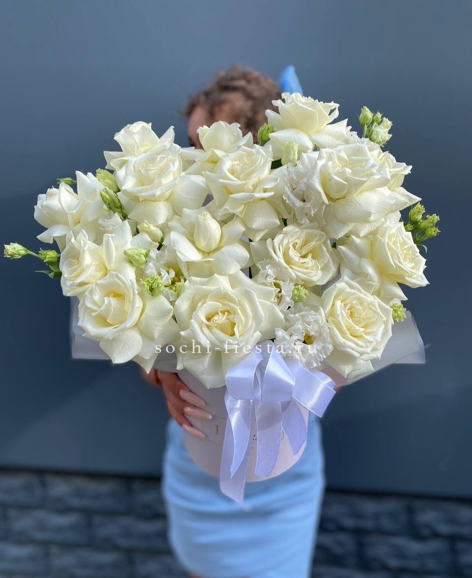 гортензии, эустома, розы, бомбастик, эвкалипт, антиринум в боксе 25.
