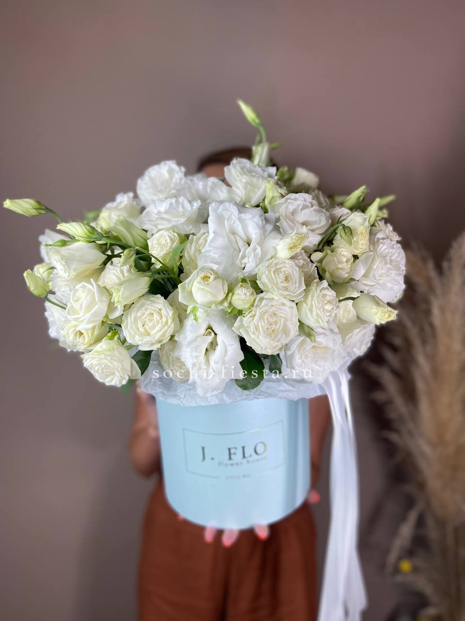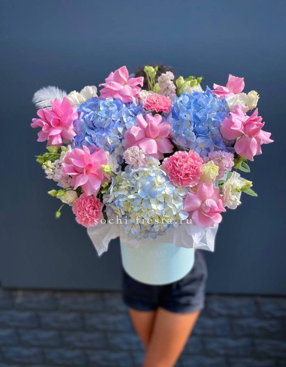 Композиция в коробке объединяет пышную гортензию, воздушную эустому и кустовые розы, Джумилию с яркими гербами и хлопком. Плотное заполнение создает округлую форму, где каждый цветок находит свое место без пустот.