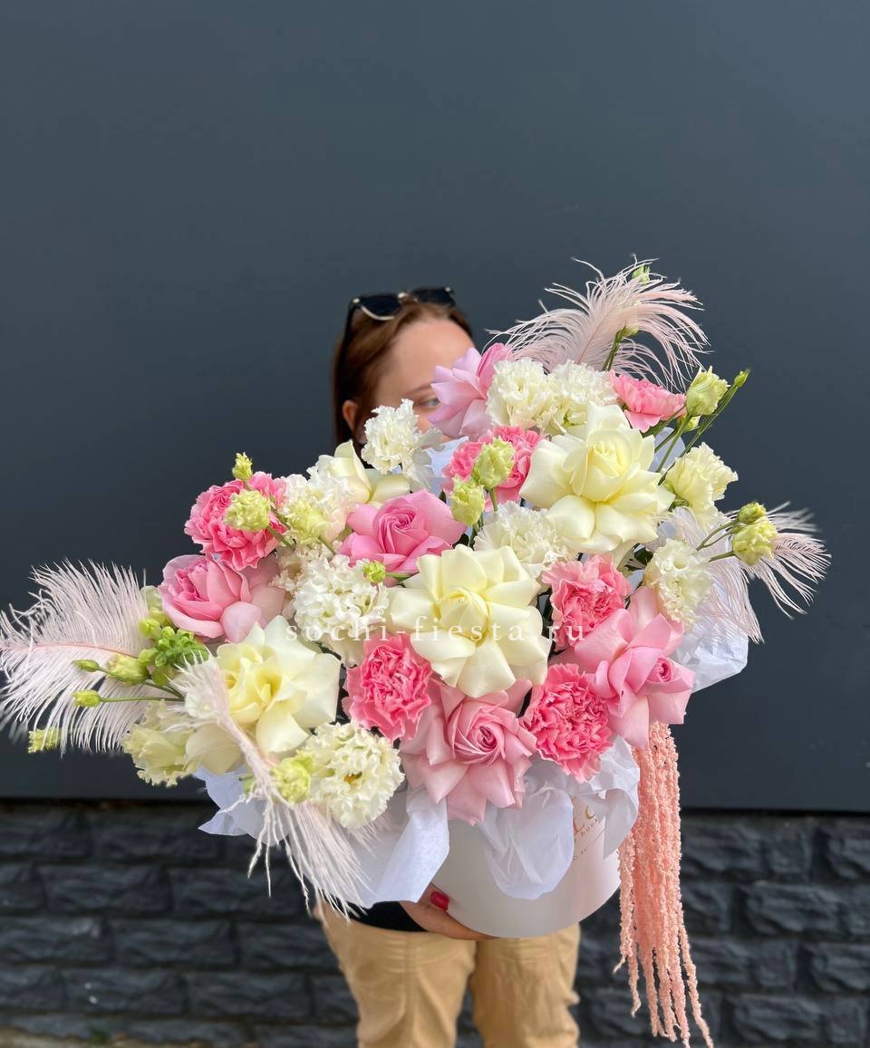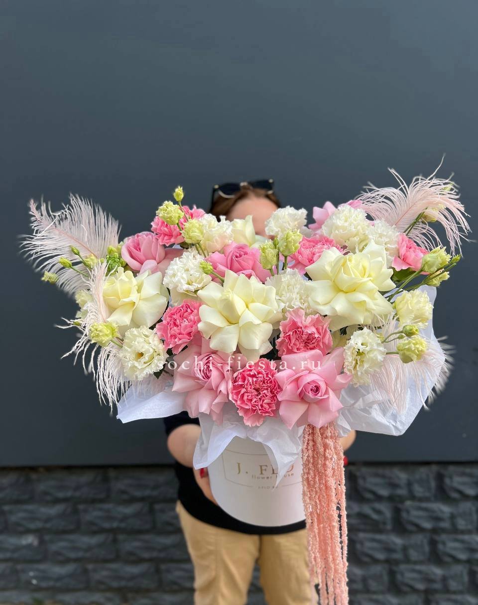 Воздушные перья словно парят между бутонами роз и эустомы. Диантус добавляет фактурной глубины всей композиции. Мягкие оттенки и необычные элементы создают легкое романтичное настроение.