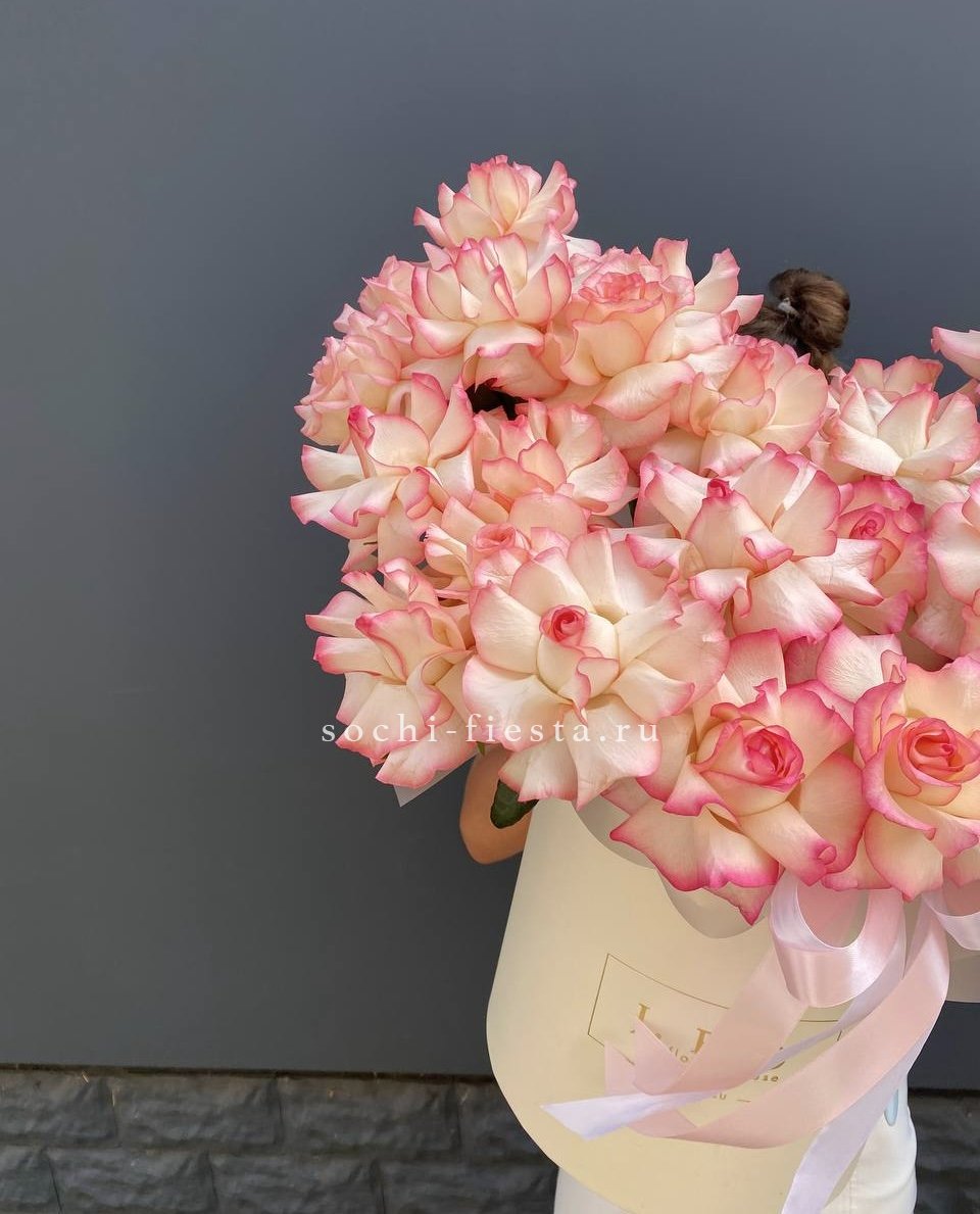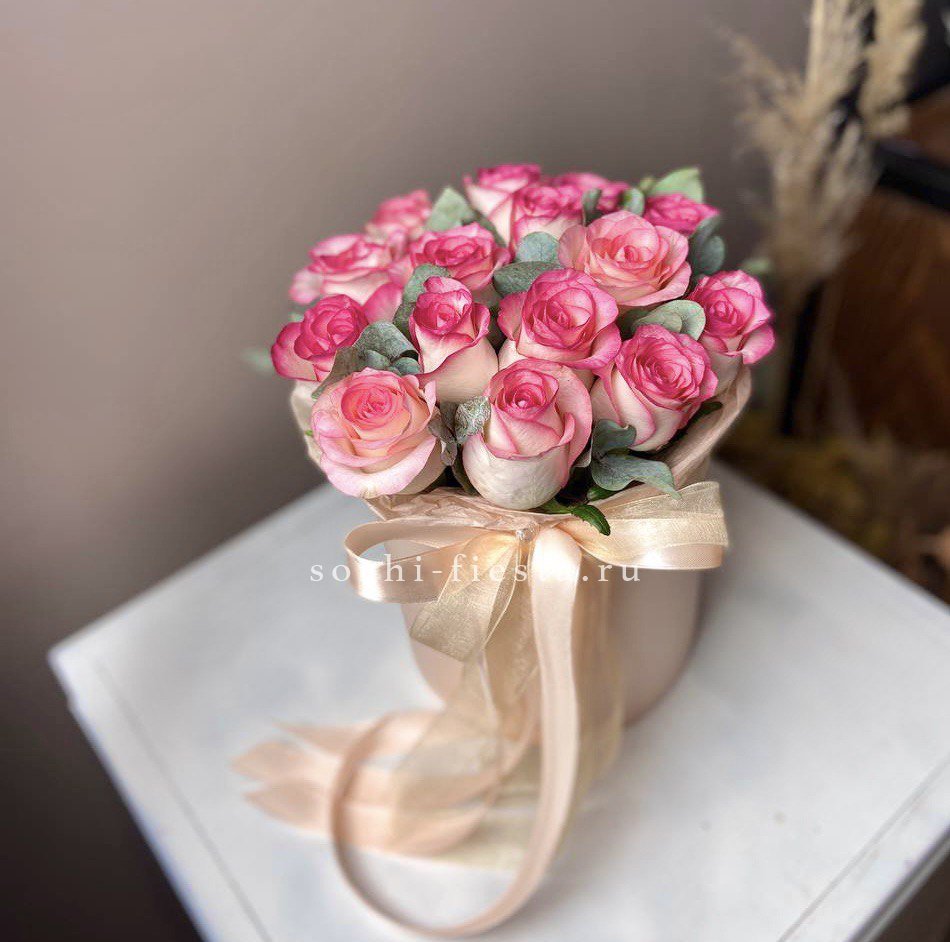 Пионовидная роза Бомбастик образует плотные бутоны с множеством лепестков. Эвкалипт добавляет свежести и завершает форму. Компактная коробка удобна для передачи из рук в руки.