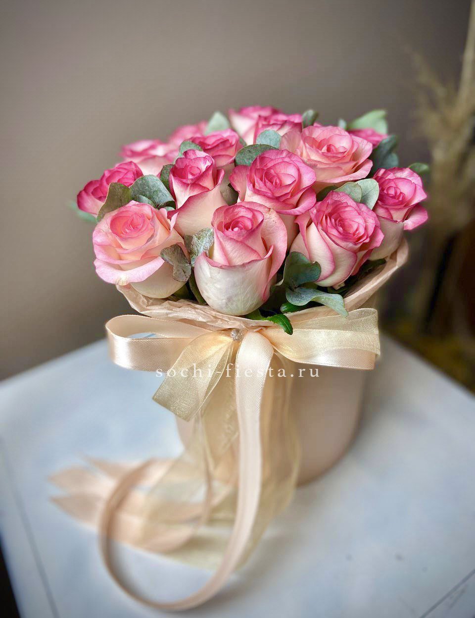 пионовидная кустовая роза Бомбастик, эвкалипт, лента, цилиндр D16.
