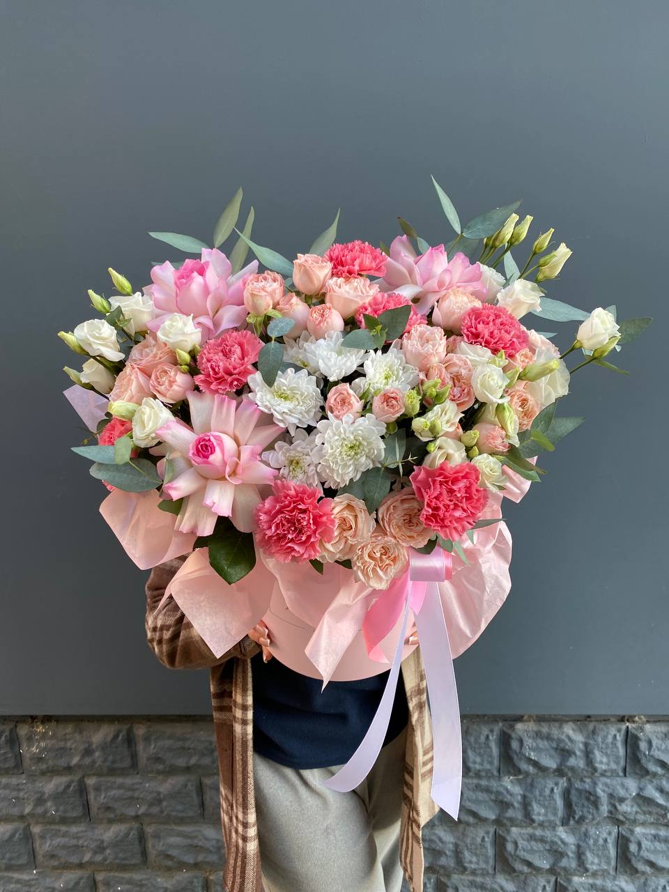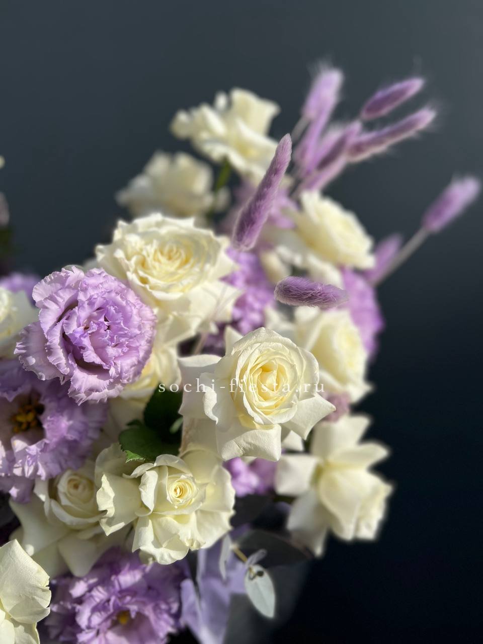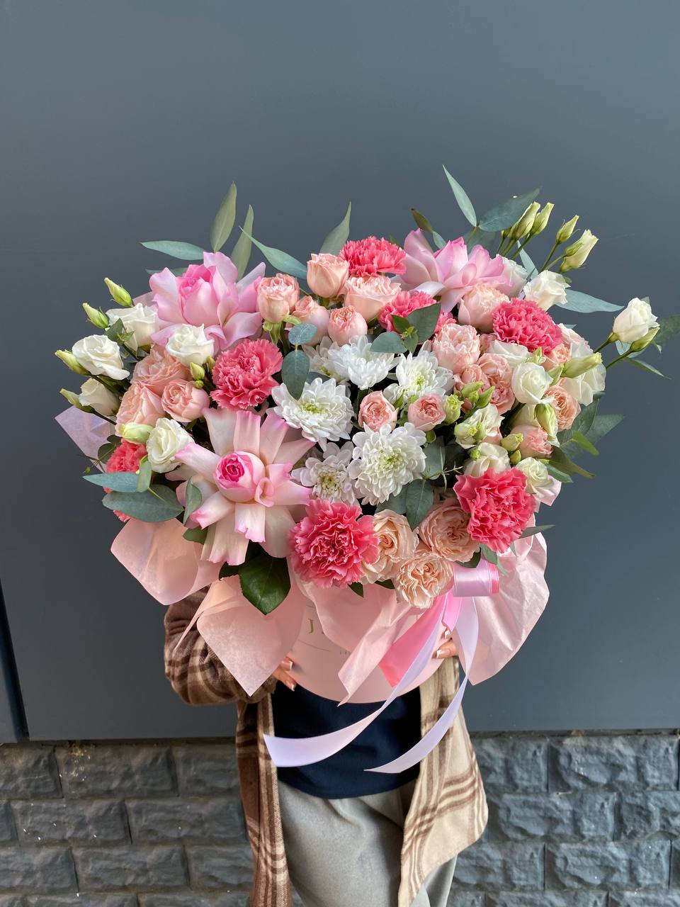 Французские розы и эустомы образуют плотную текстуру с мягкими переходами оттенков. Бархатистые лепестки создают объёмную композицию, которая завершается свежими веточками эвкалипта.