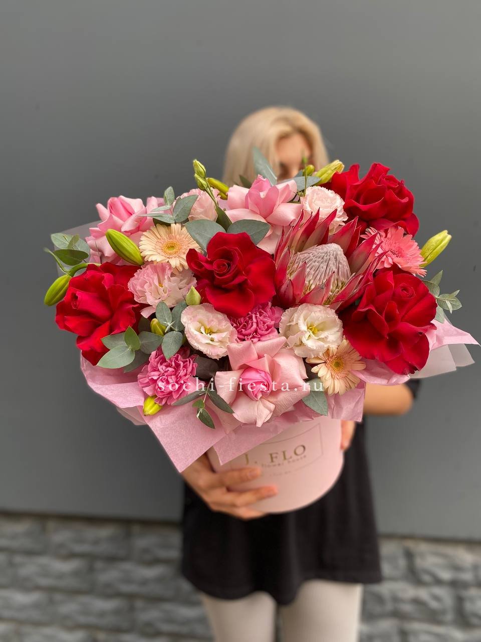 выполнен из эустом, французских роз, эвкалипт, цилиндр D20.