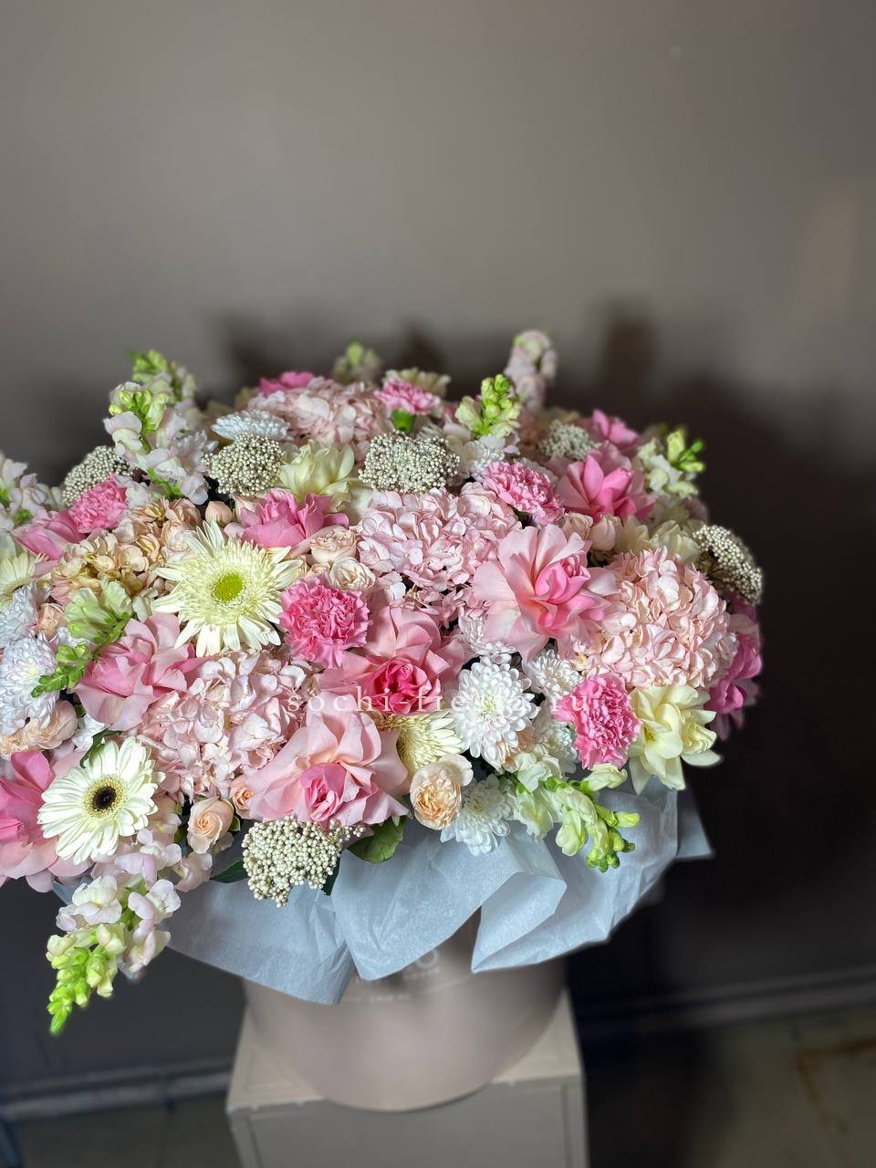 Композиция в светлом цилиндре выдержана в единой нежно-розовой палитре. Оттенки перетекают один в другой, создавая спокойное и цельное визуальное впечатление.