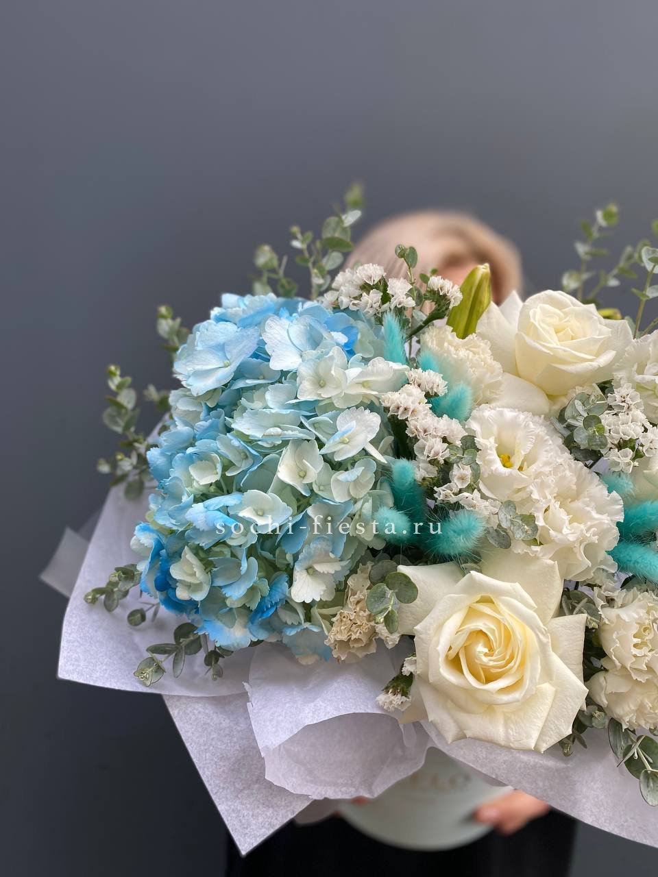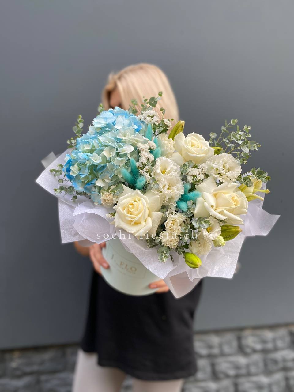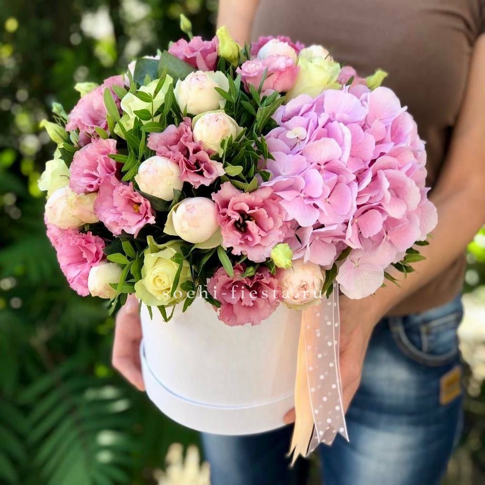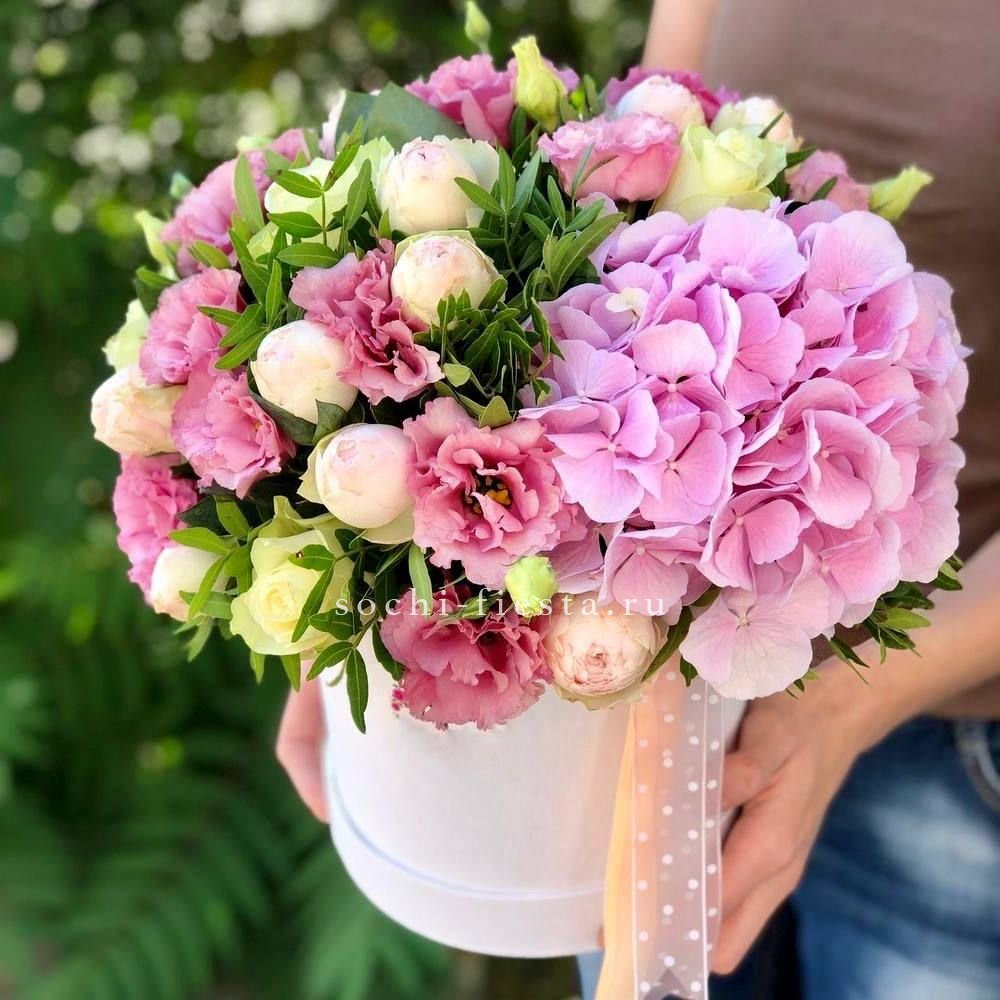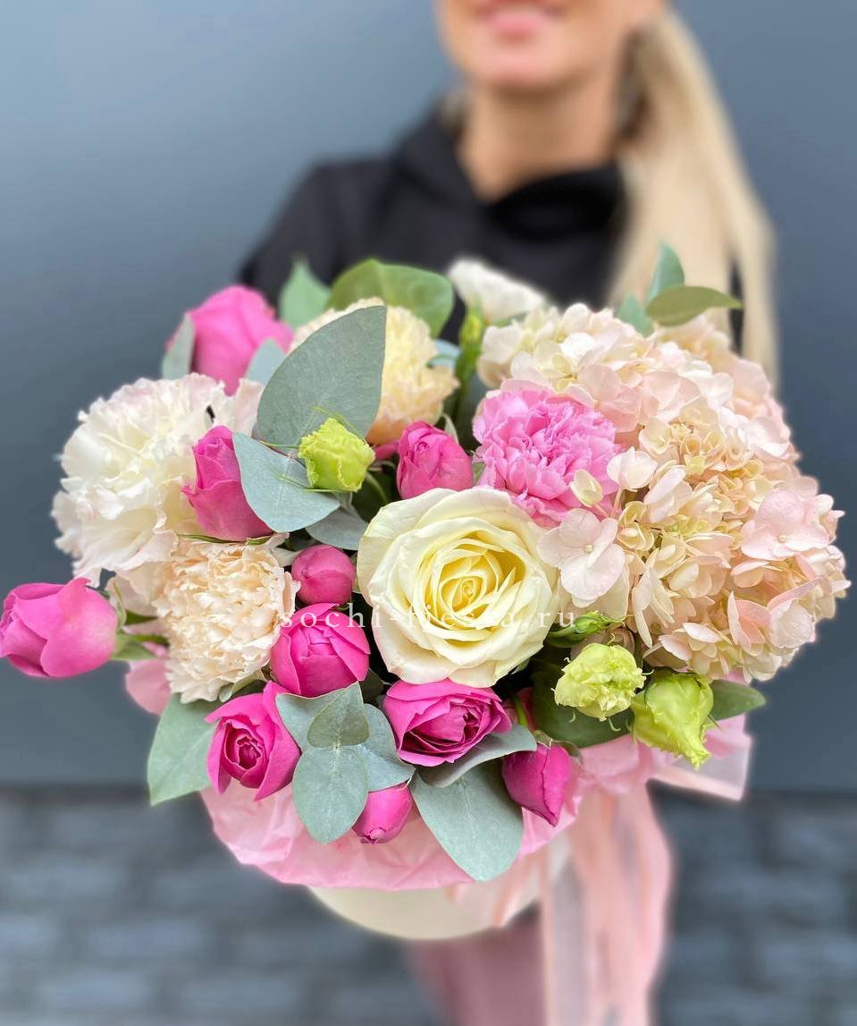 гортензия, кустовые розы, диантус, мисти баблс, эвкалипт, лента, цилиндр D16.