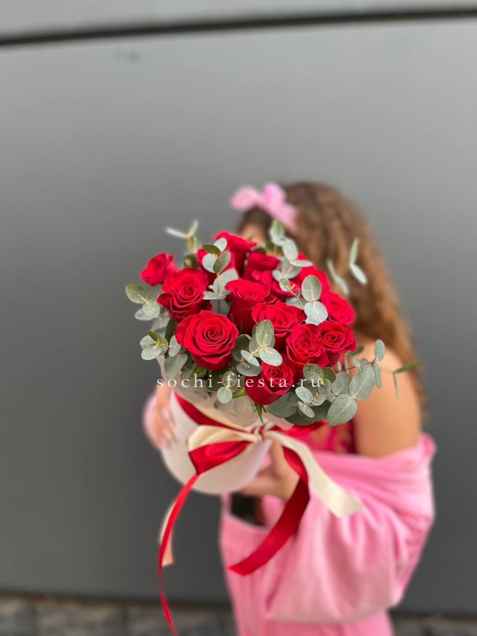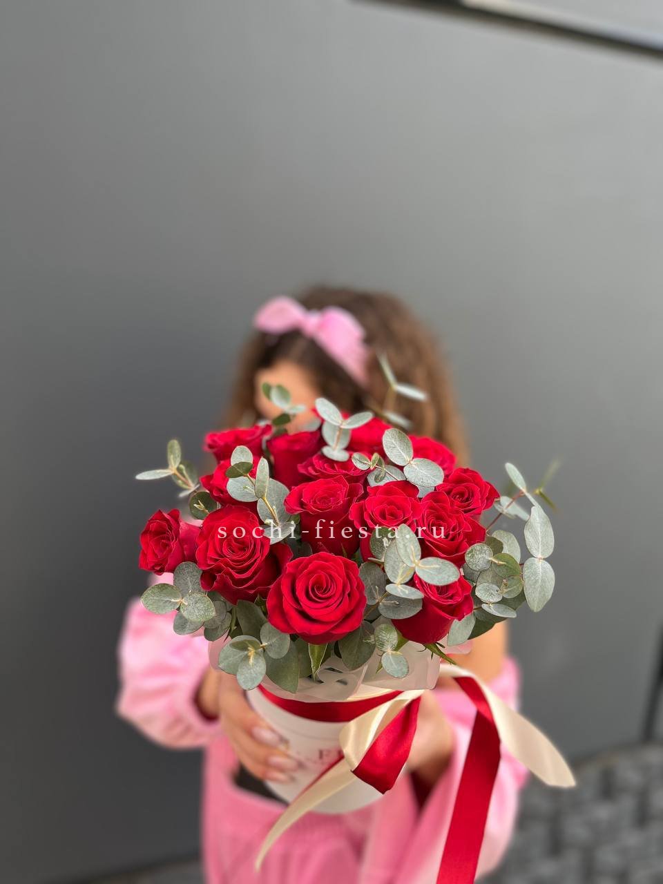 Кустовые розы собраны в плотную круглую форму и дополнены вертикальными стеблями вероники. Композиция в цилиндре выглядит графично и удерживает силуэт без дополнительных конструкций.