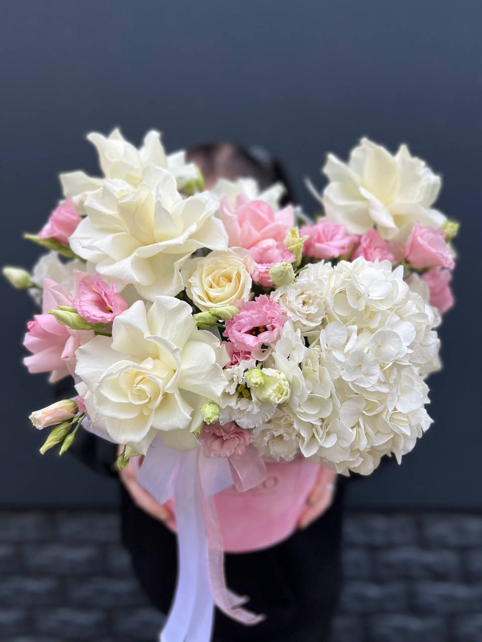 Воздушная композиция в бархатной коробке раскрывается пышными соцветиями гортензии и многолепестковыми бутонами эустомы. Розы двух оттенков создают мягкий переход от белоснежного к пудровому. Флористическая пена сохраняет свежесть каждого цветка надолго.