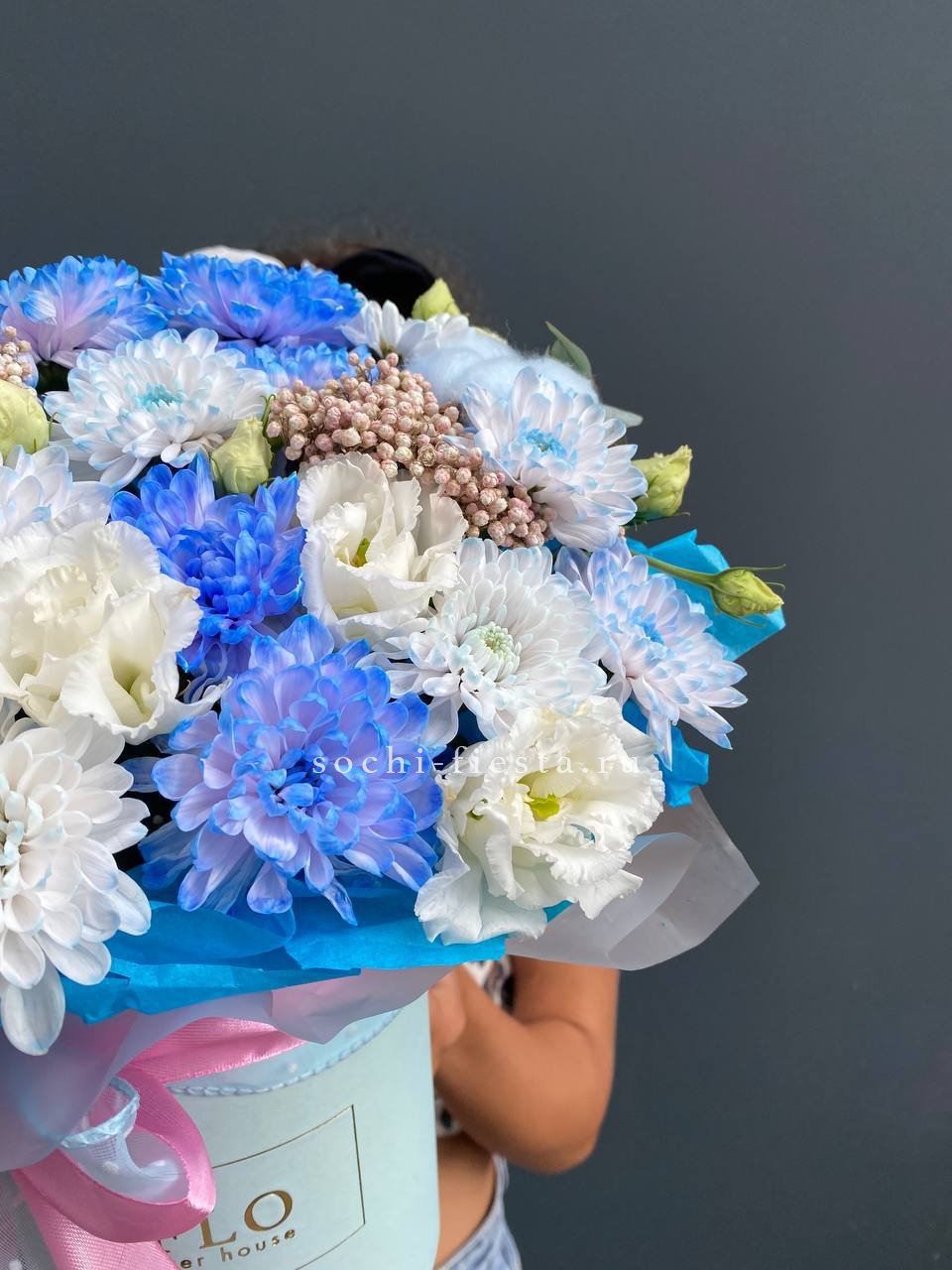Кустовые хризантемы и эустома с хлопком формируют лёгкую воздушную массу. Озотамус поддерживает природную фактуру. Композиция долго сохраняет свежий вид и не требует сложного ухода.