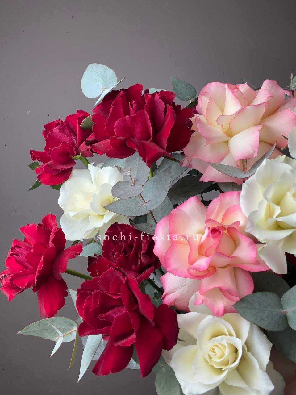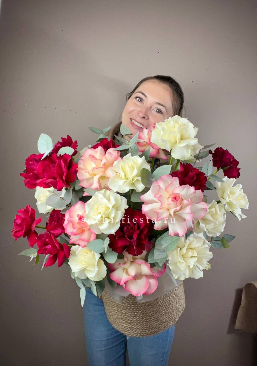 белые и кустовые розы, диантус в джутовом кашпо с эвкалиптом.