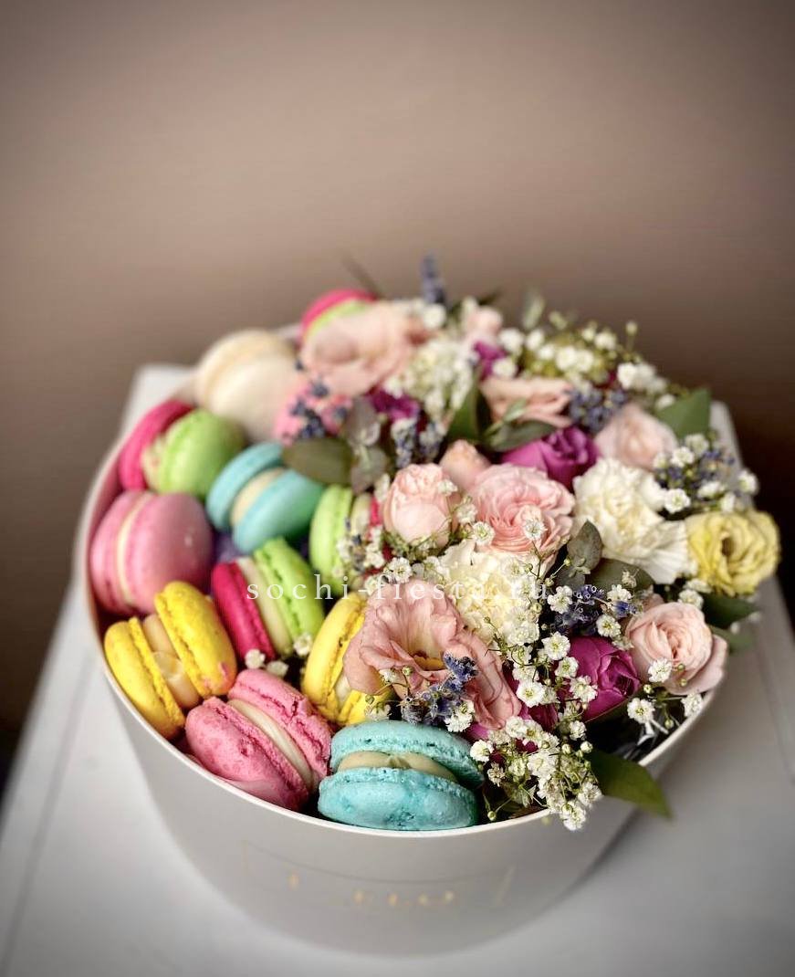 роза кустовая, эустома, диантус,  эвкалипт, 5 макаронс, белый цилиндр D15 Цвет коробки может быть согласован с клиентом.  Наполнение может меняться по наличию.