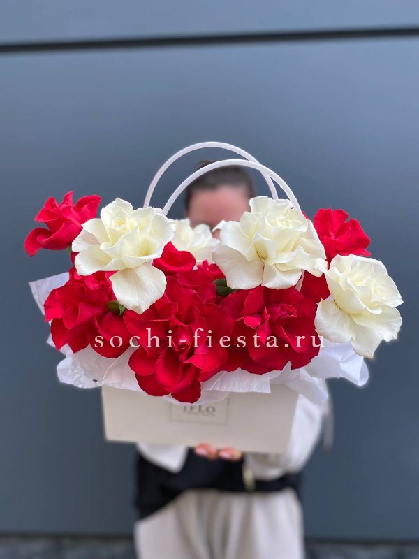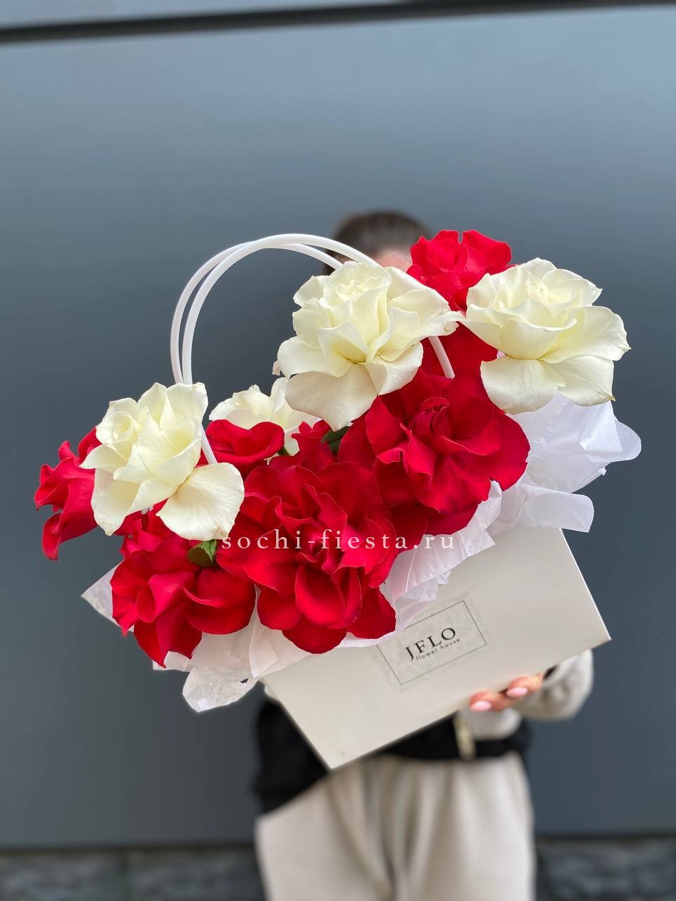 Пышные головки пионовидных роз задают объём, а мелкие соцветия диантуса разбивают плотность. Гортензия добавляет воздушную текстуру, эвкалипт смягчает линии. Композиция в сумке-кашпо выглядит свободно и живо.