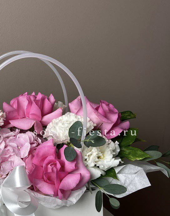 розовая роза, пионовидная роза, диантус, гортензия, эвкалипт, лента, сумка-кашпо.