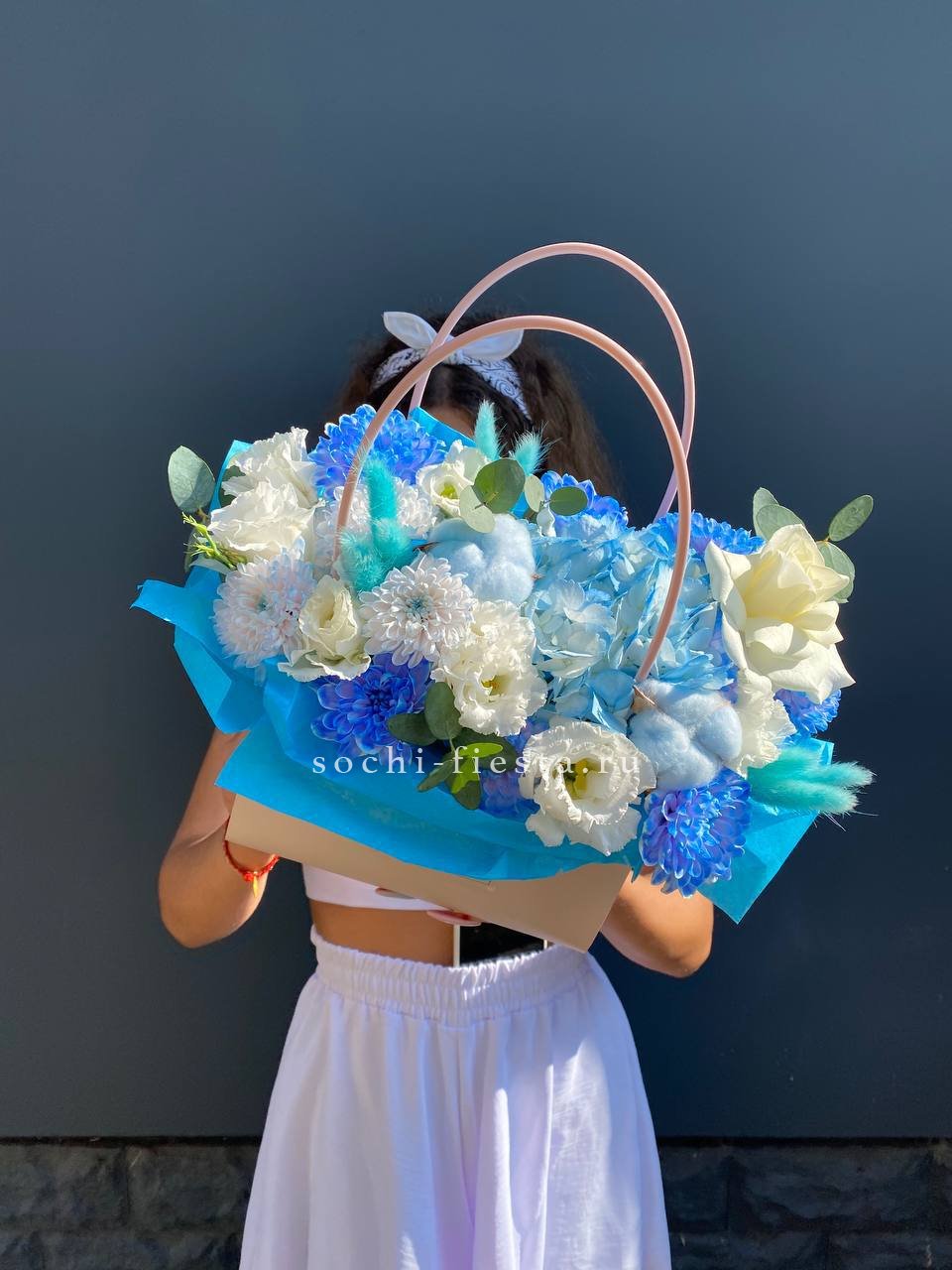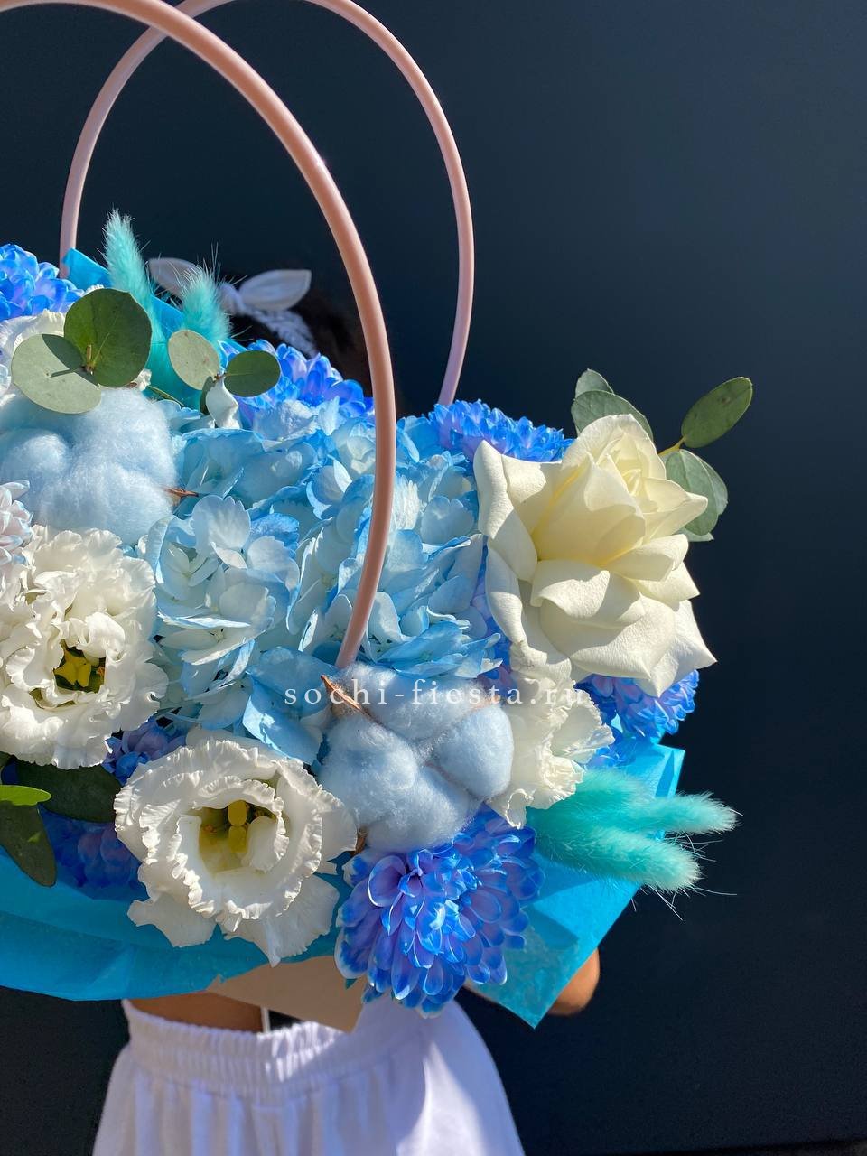 гортензия, герберы, диантусы, роза, альстромерии, эустомы, лента, эвкалипт,  сумка-кашпо.