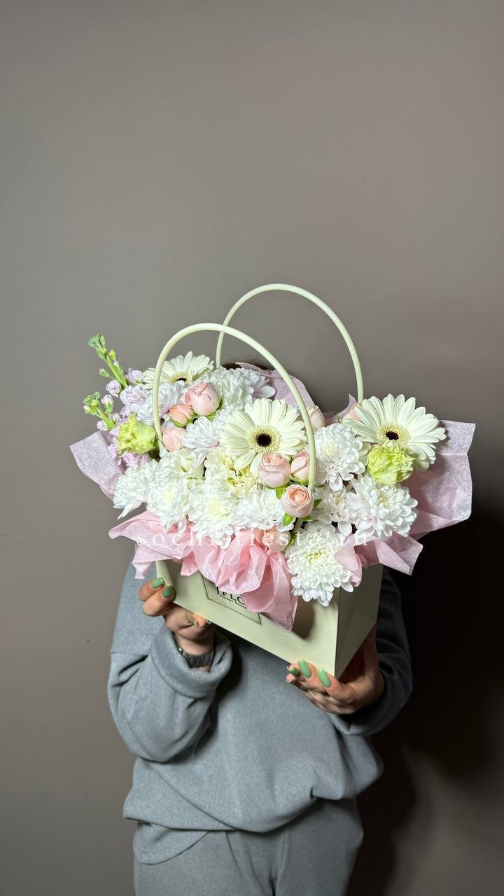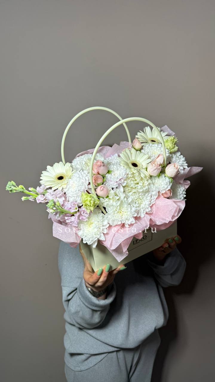 Гортензии задают плотную основу, герберы и диантусы вносят ритм, а альстромерии с эустомой создают движение вверх. Разнообразие форм и оттенков выстраивает многослойную картину в одной сумке.