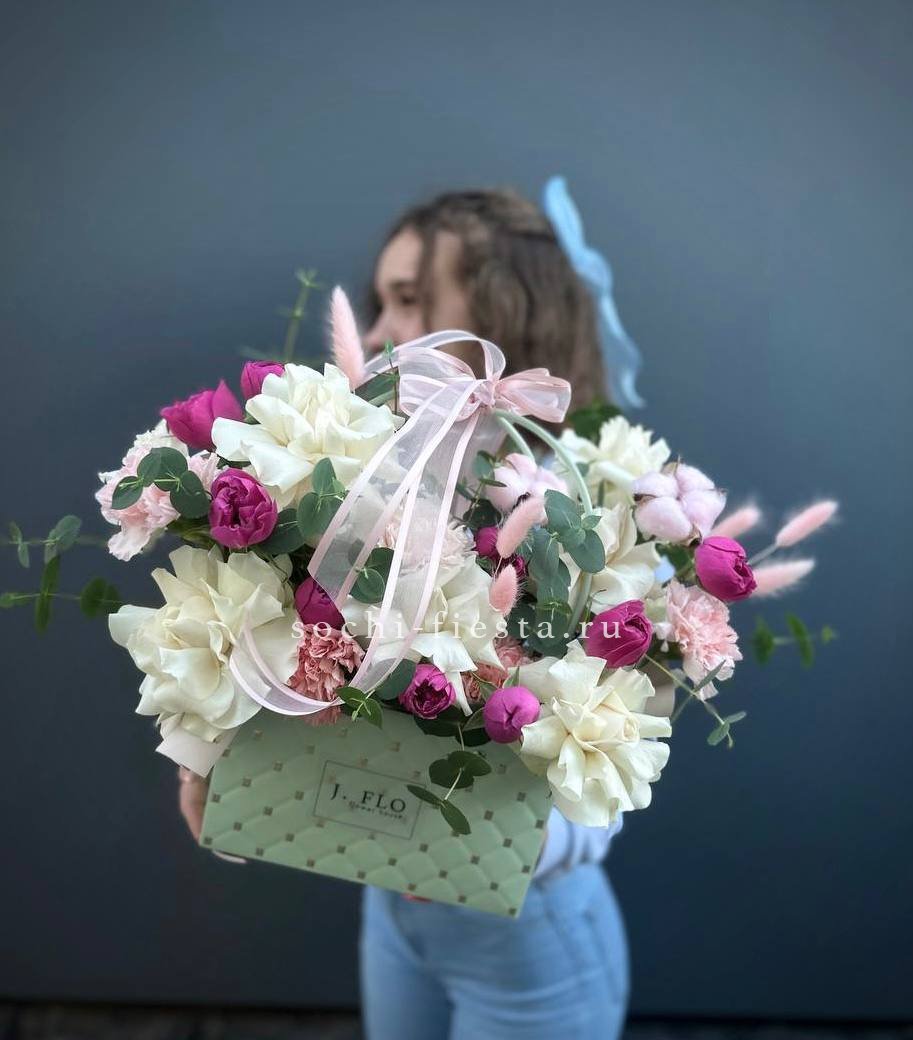 Воздушная композиция из диантусов и альстромерии в удобном формате. Цветы на оазисе держат свежесть долго и не требуют сложного ухода.