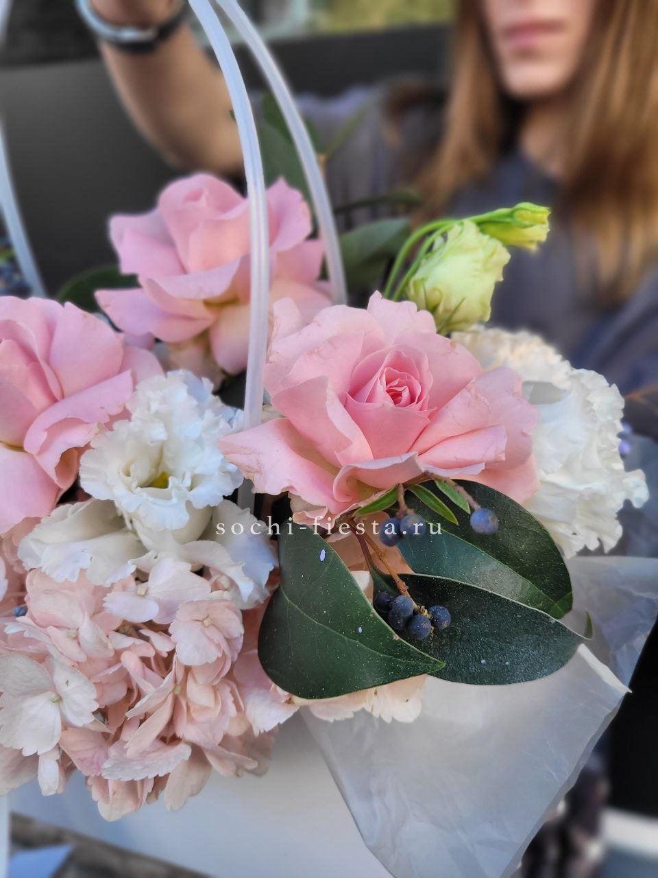 нежная композиция на базе оазиса с применением одноголовых роз, эустомы, гортензии, диантусов, эвкалипта, упаковки.
