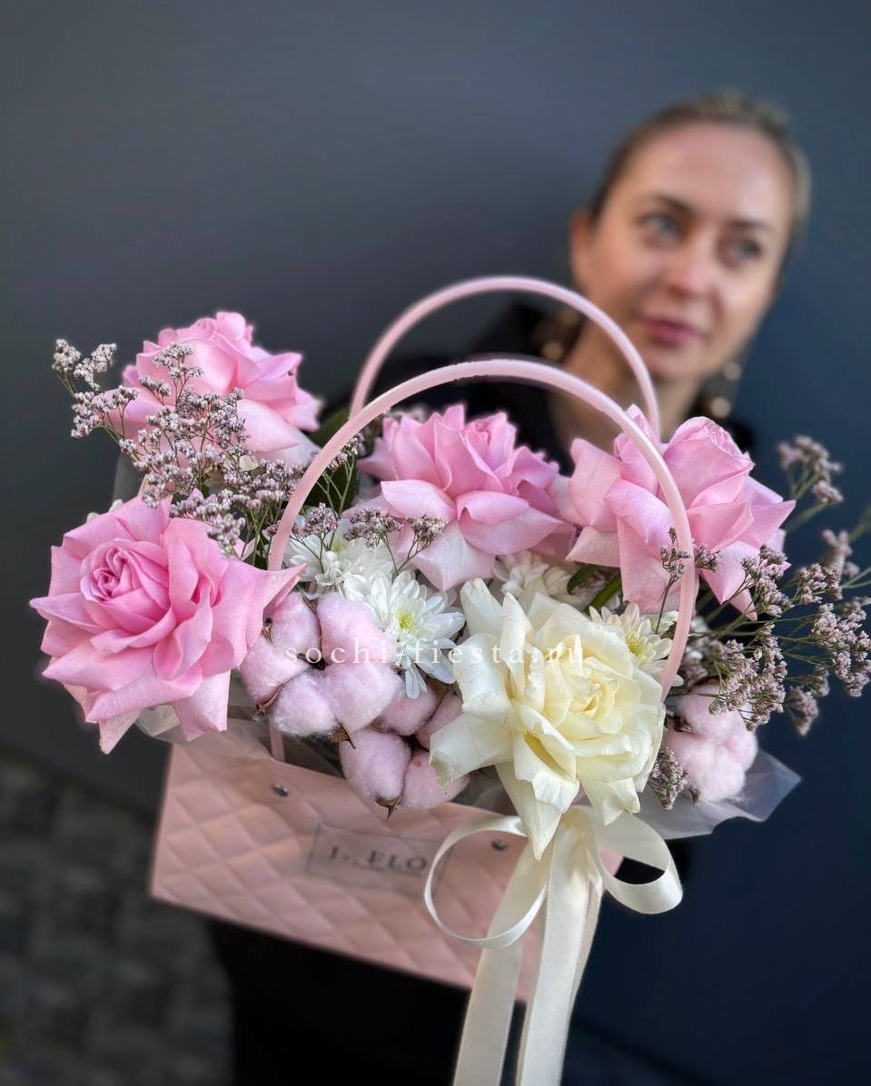 Белые и розовые розы образуют воздушную композицию с мягкими коробочками хлопка и лимониумом. Сумка-кашпо Sofi держит форму и позволяет разместить цветы на столе или полке. Букет выглядит аккуратно и остается свежим долгое время.